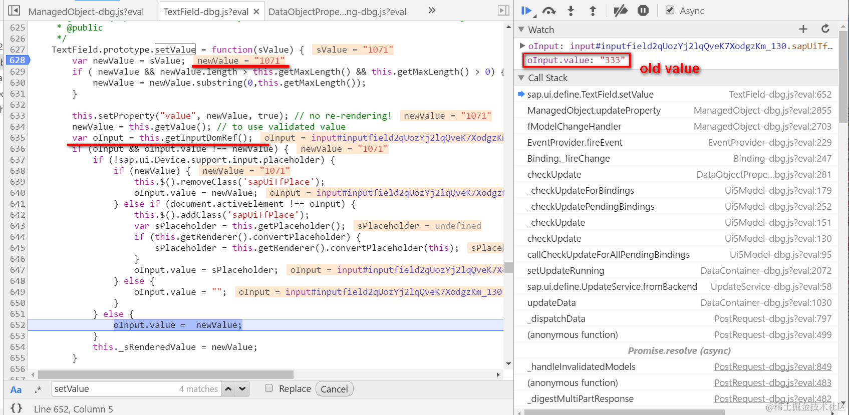 The underlying DOM element for BO ID input field is retrieved in line 635 and stored in variable oInput, so oInput.value contains the old value currently displayed in the UI.