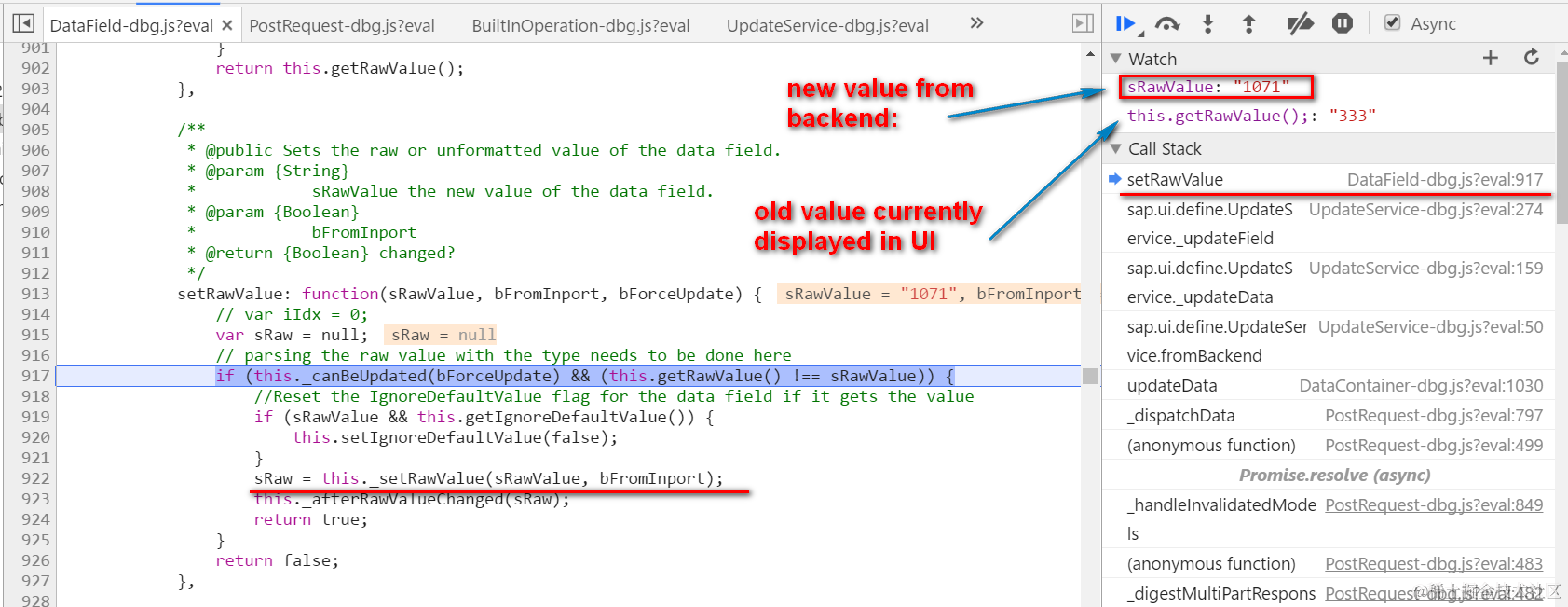 Please notice that the assignment in line 922 will NOT lead to the UI refresh with new value 1071 displayed, because till now, only the latest value of DataField is changed, but the underlying DOM node which actually controls the html display remains unchanged.