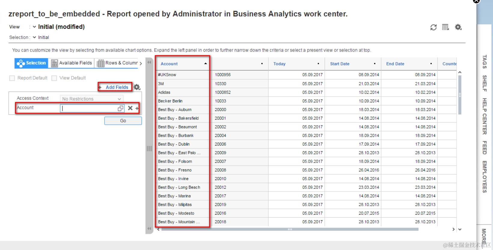 In selection tab, choose “Account” field in column “Screen Field” from drop down list, so that a mapping between screen field in UI and Account selection field in report is established.