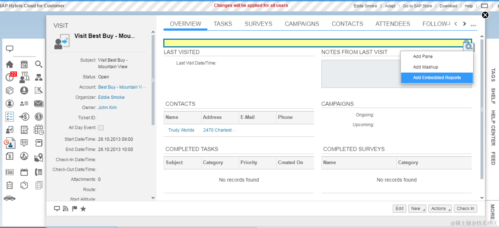 (3) Go to Visit overview page, enter adaptation mode, click menu “Add Embedded Reports”: