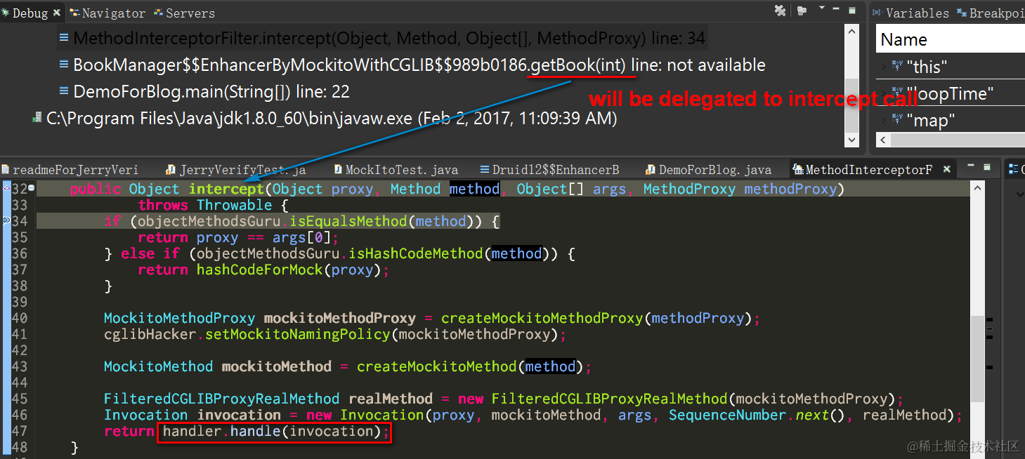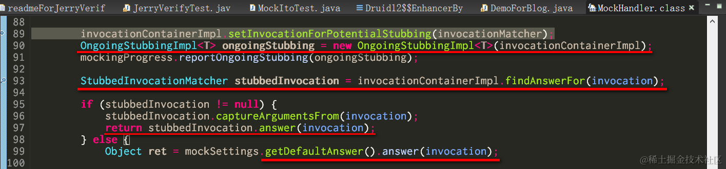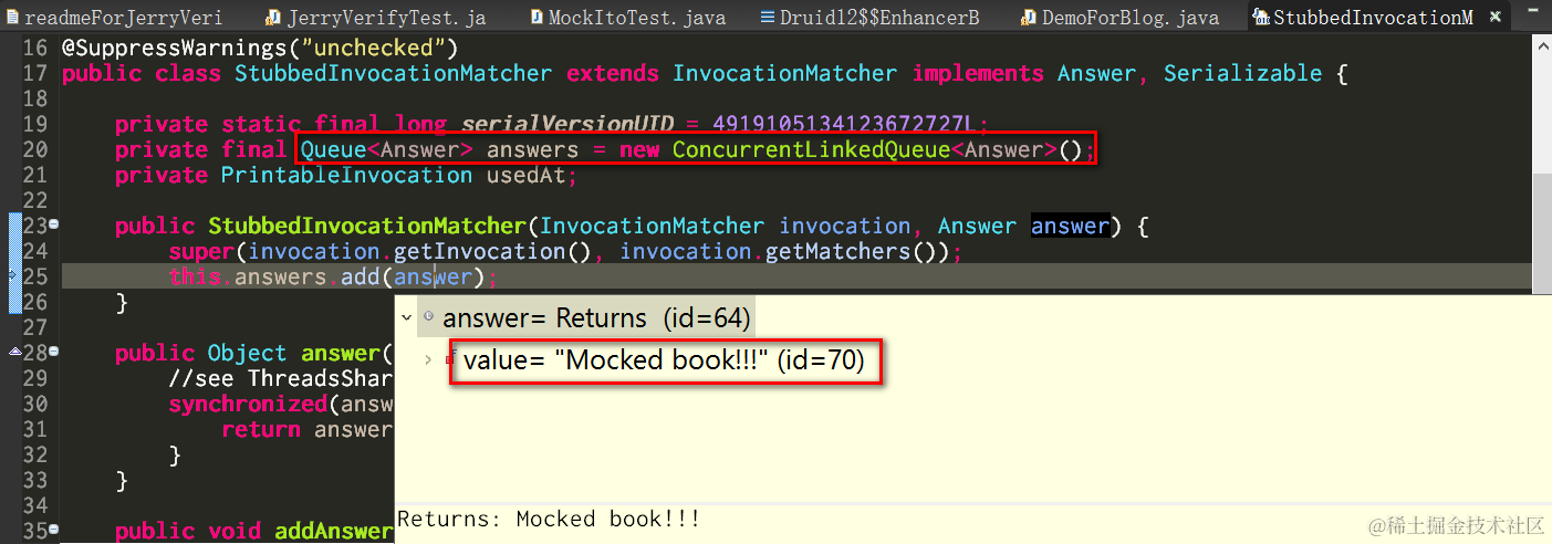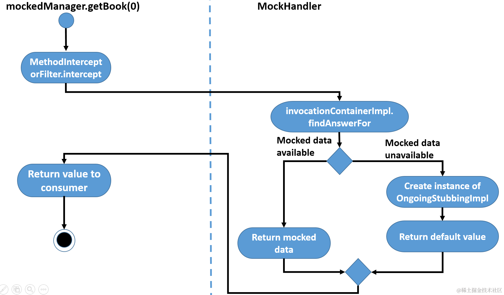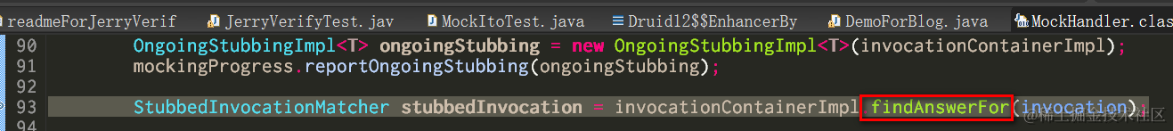 In line 93, Mockito will check whether there is available mocked data ( In Mockito the terminology for “mocked data” is “answer” ) for current metod call in method findAnswerFor. If available, go to IF branch in line 97 to return mocked data, or else return default answer, in my example I don’t prepare any mocked data for getBook, so it simply returns null.