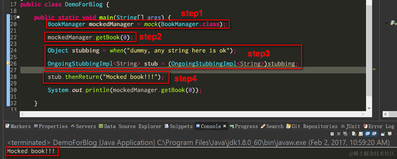 Step4: stub.thenReturn(“Mocked book!!!”);