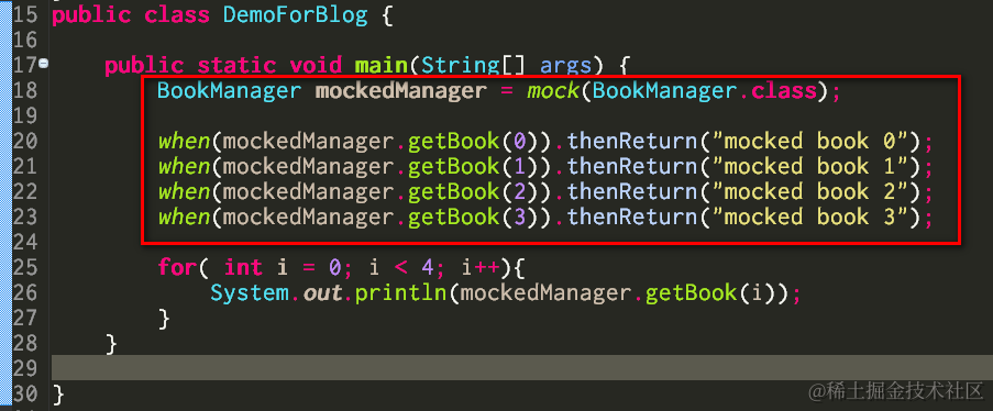First in line 18 a proxy class is generated based on BookManager which is to be mocked, then line 20~23 we told the Mockito “when the method getBook with specified argument ( 0, 1, 2, 3 ) are called, please return given mocked data “mocked book {index}” accordingly.