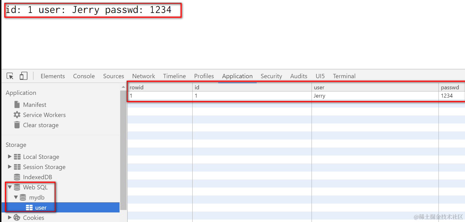 Open the html page with Chrome, and you can find that a database with name mydb and a table user is created with one record inserted.