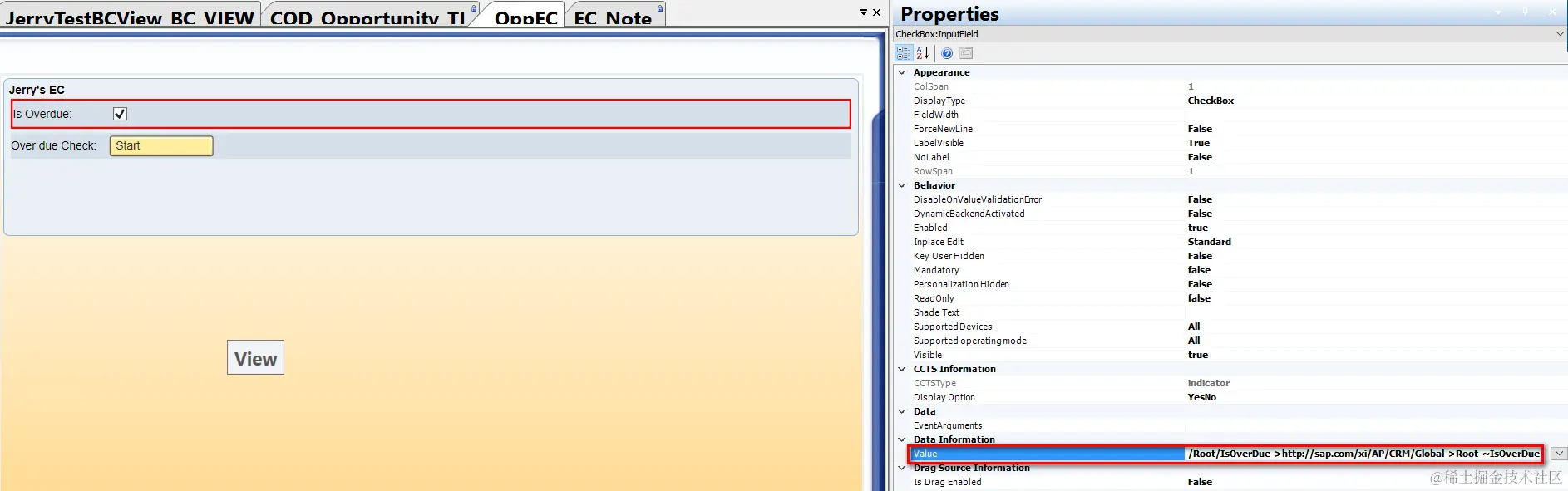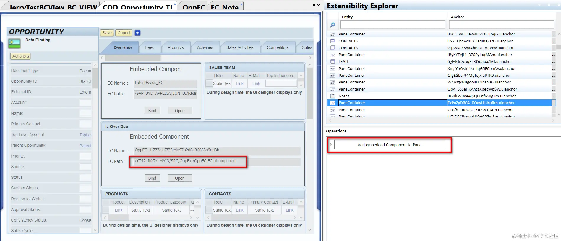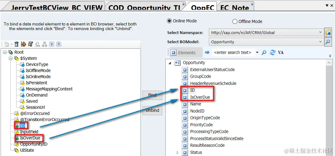 (2) Create a new embedded component OppEC, create two data field and bind them to standard BO field ID and extension field IsOverDue.