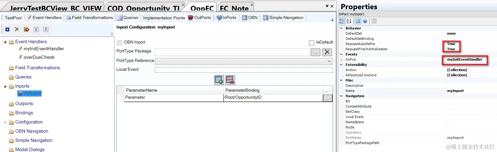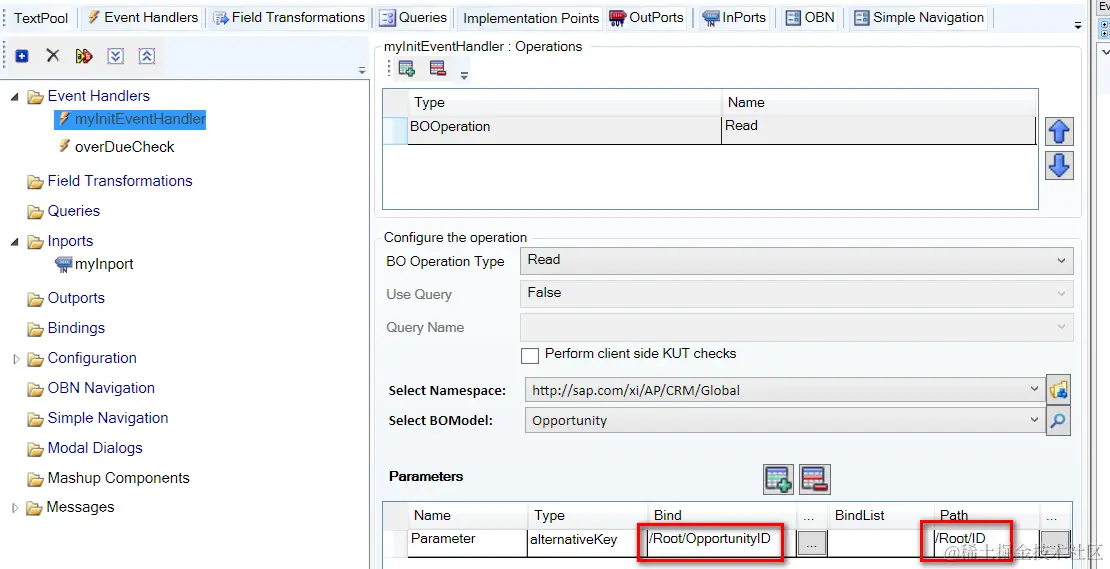Switch to embedded component’s controller tab, create an unbound data field OpportunityID, and use it as BOOperation Read’s parameter. This unbound data filled will be filled with values passed from inport to be created soon.