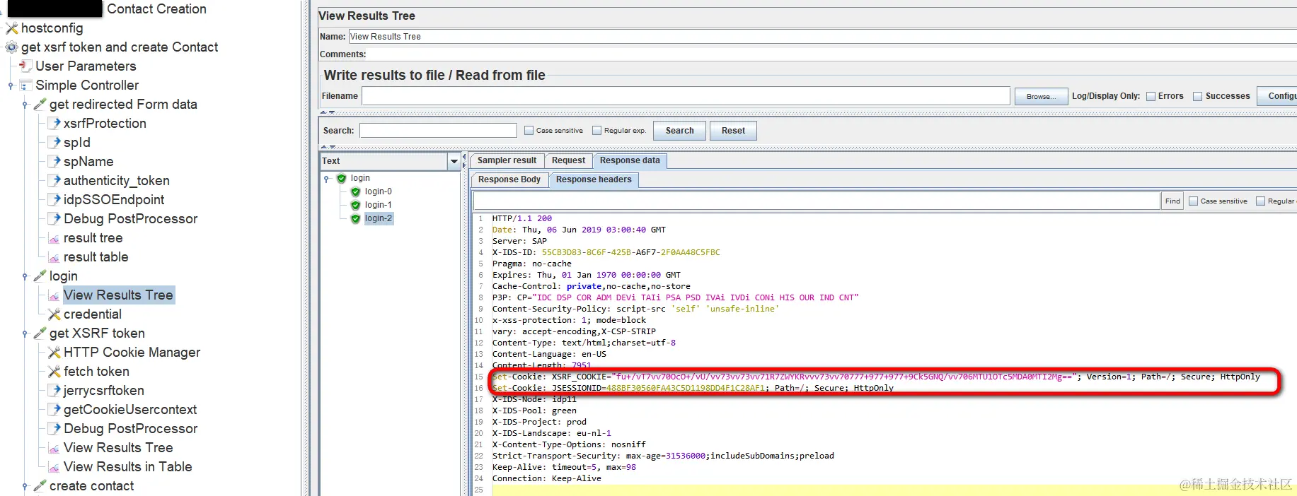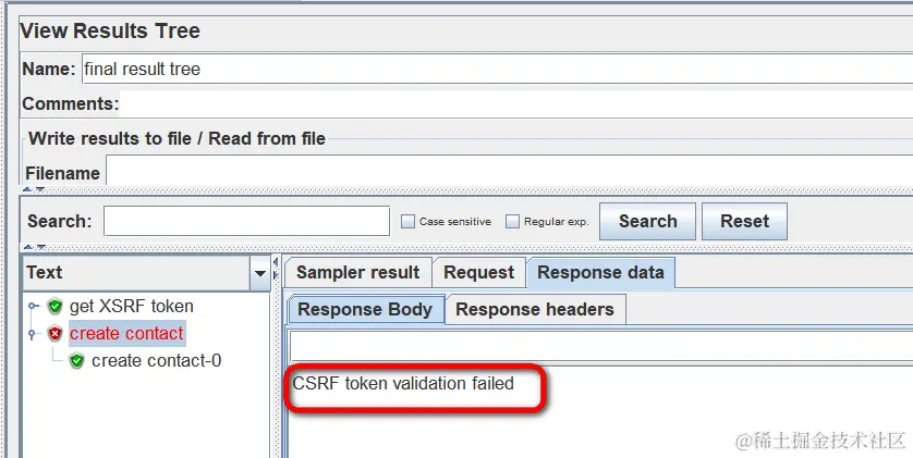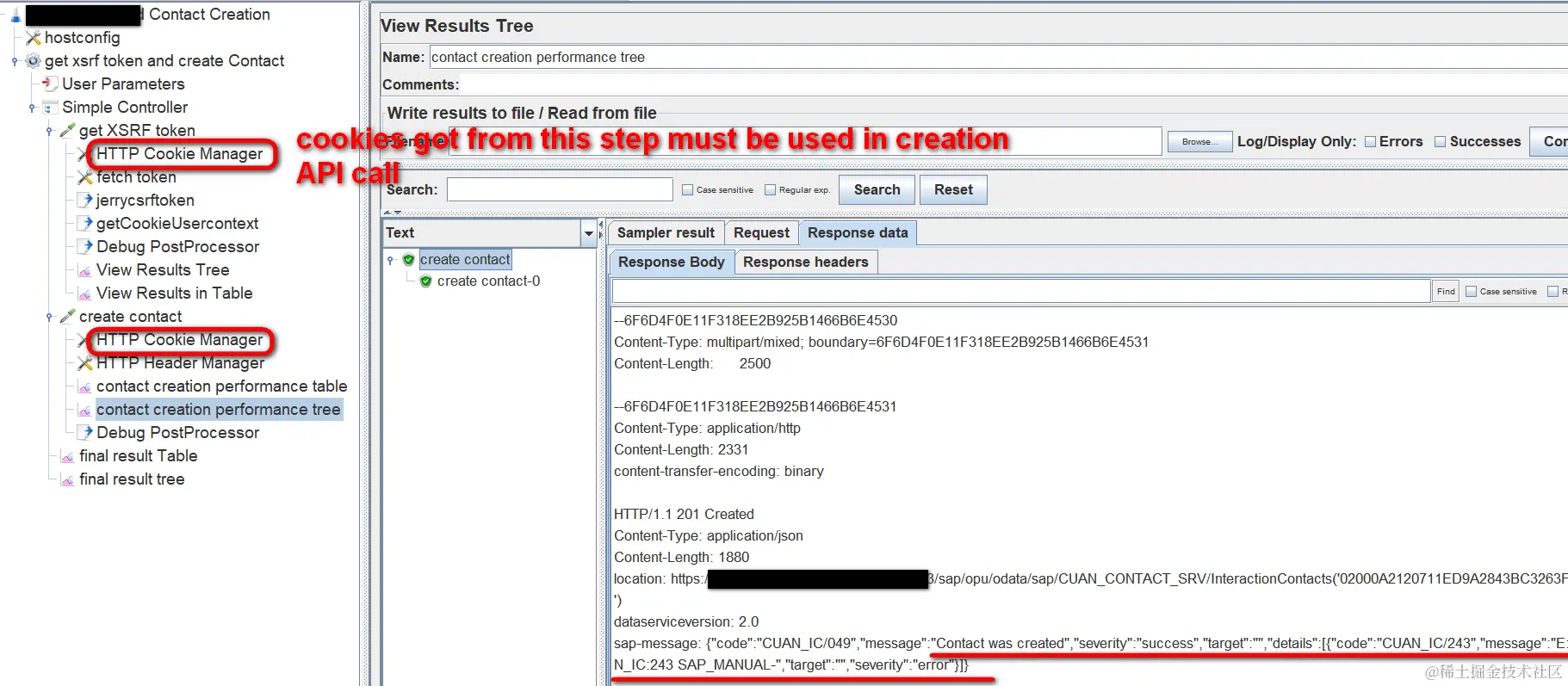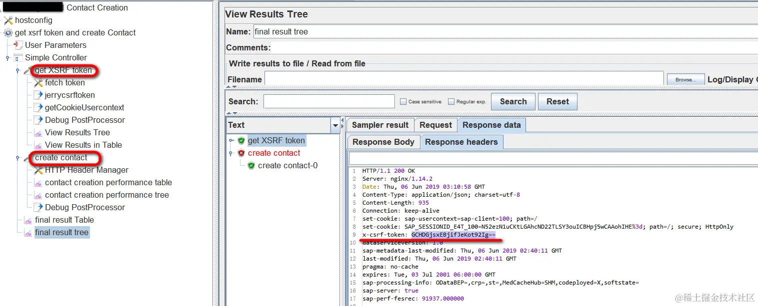 As it’s not a big deal to achieve the contact creation API in Postman, the same idea would be applied in jMeter as well: wrap two HTTP request within a Simple Controller, one request responsible for fetch XSRF token and the other for the real creation call. Once executed the jMeter project, the first call succeeds as my expectation – the token is retrieved successfully and available in HTTP response header field “x-csrf-token”.