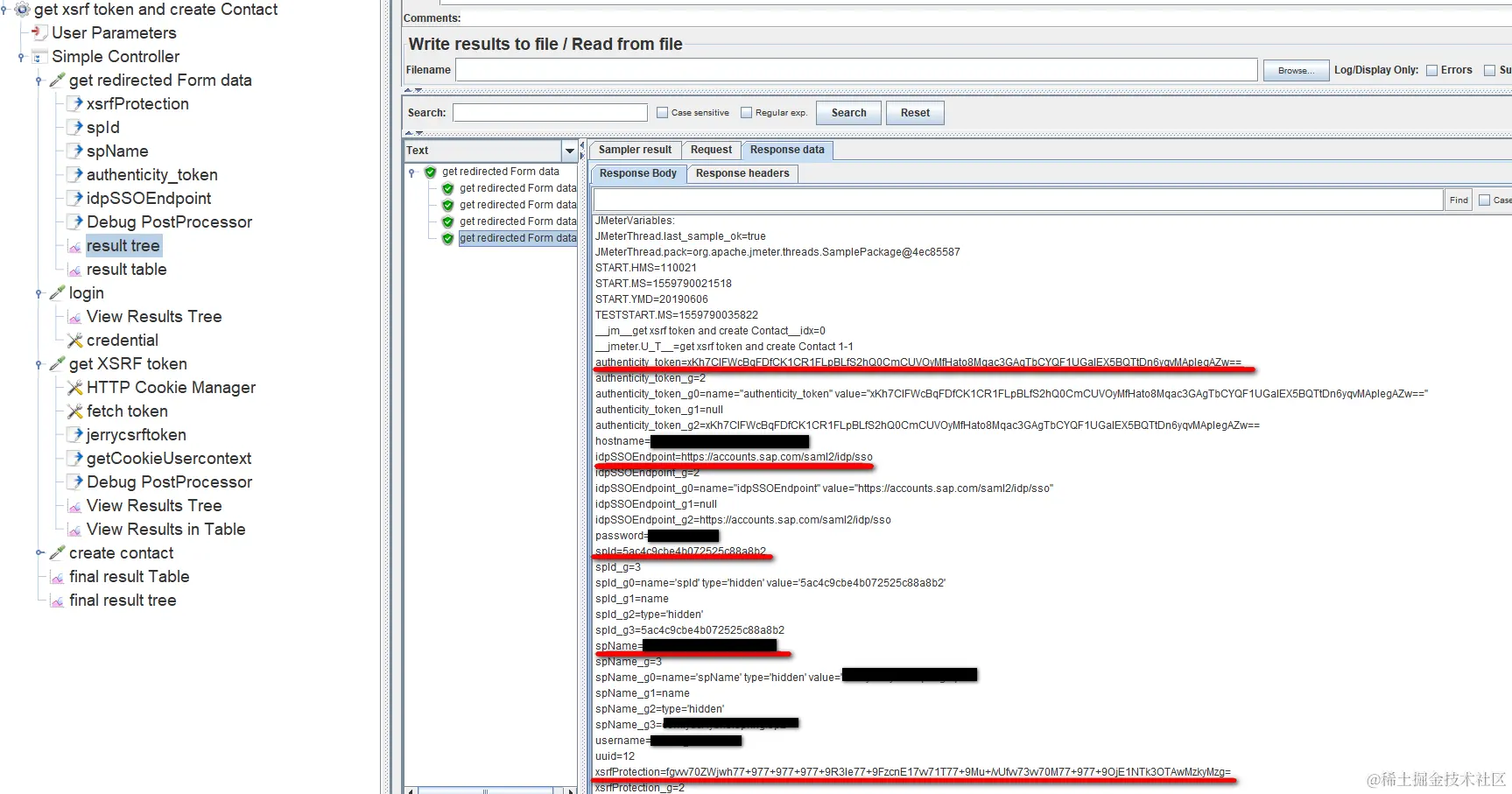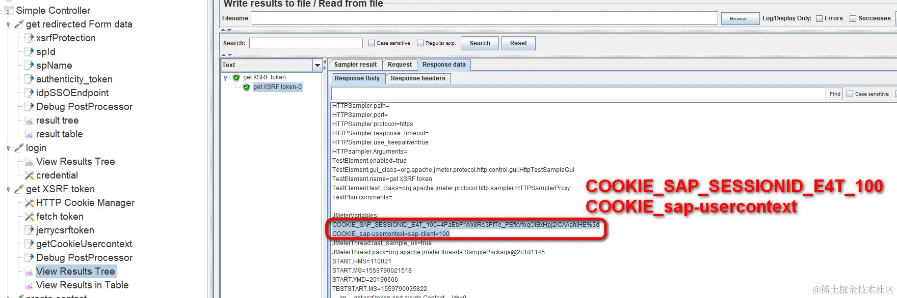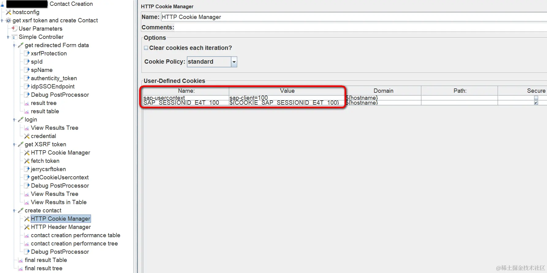 As it’s not a big deal to achieve the contact creation API in Postman, the same idea would be applied in jMeter as well: wrap two HTTP request within a Simple Controller, one request responsible for fetch XSRF token and the other for the real creation call. Once executed the jMeter project, the first call succeeds as my expectation – the token is retrieved successfully and available in HTTP response header field “x-csrf-token”.