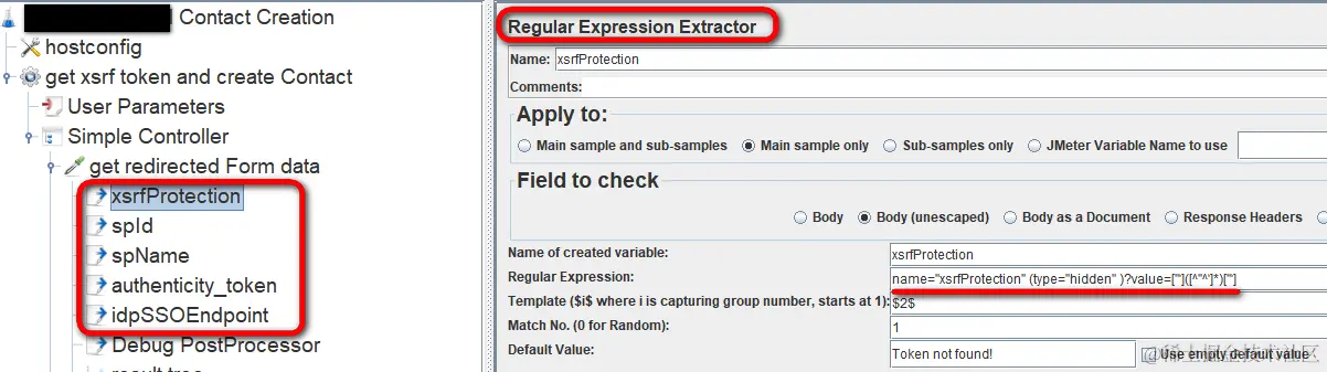(1) Create five seperate Regular Expression Extractor to parse the five parameters necessary for IDP server authentications from hidden fields in HTTP response form body: