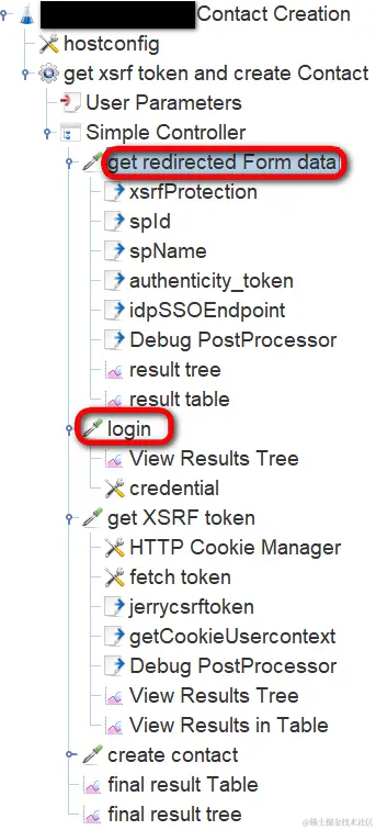 In the end I also figured out the first two HTTP requests contained in my jMeter project, that is, “get redirected Form data” and “login”, are actually optional. Only keep in mind to store cookies got from CSRF token fetch step and use them in creation API call, and that’s enough.