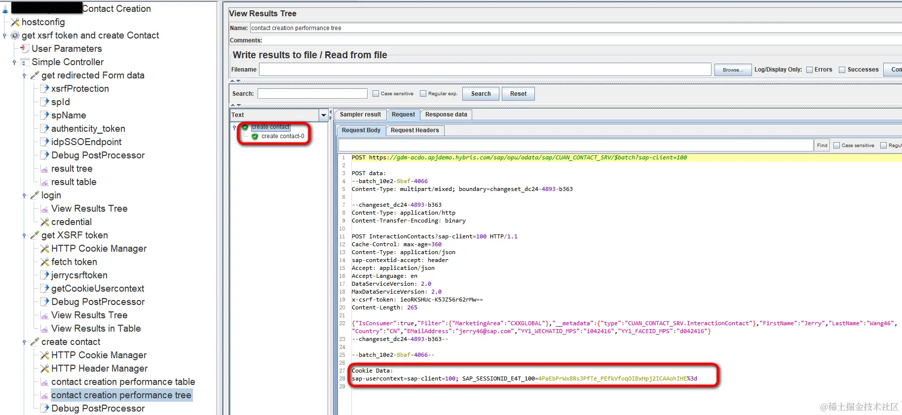 Since we need to deliver this demo in SAP Cloud Forum site in Shanghai, and it is assumed that there will be lots of guests who would like to try this solution which leads to the possibility that multiple contact creation request would be sent to S/4HANA system simultaneously. As a result as one of demo preparation steps, I would like to generate a large number of concurrent contact creation request using jMeter and measure its performance.