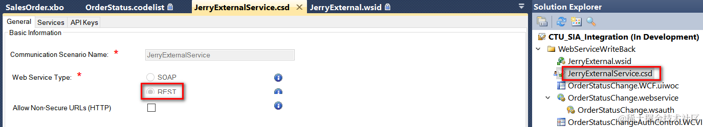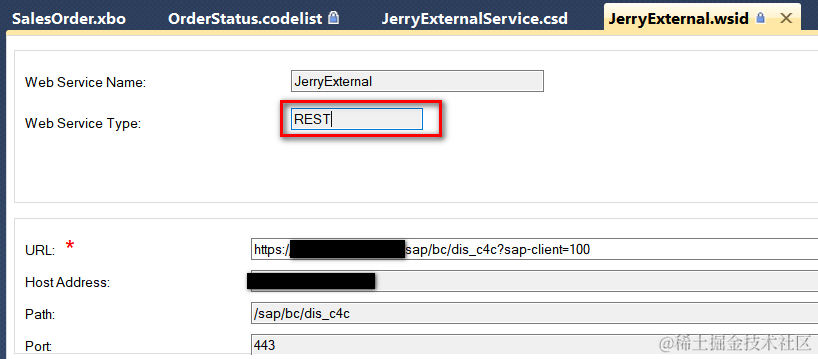 Paste the service url created in previous step into service maintenance window here and choose “REST” as web service type: