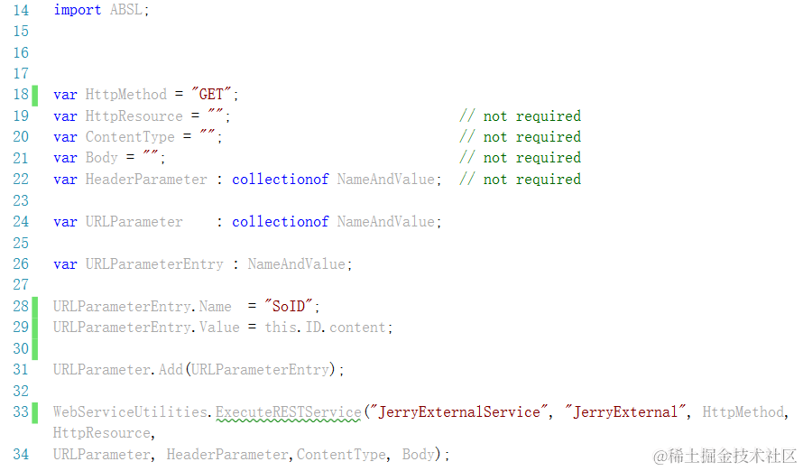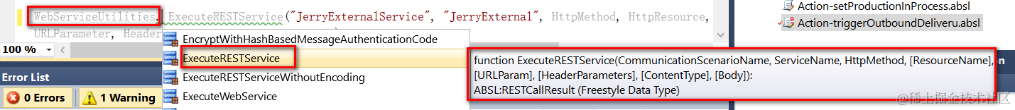 The restful service consumption is fired by ABSL utility method WebServiceUtilities.ExecuteRESTService. We can figure out its signature via code auto completion: