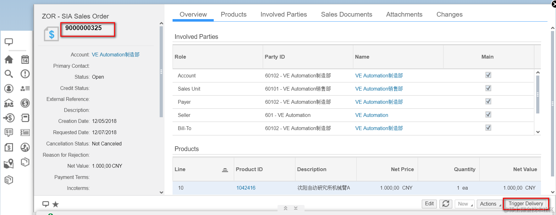 Choose Sales Order 9000000325 and press “Trigger Delivery” button,