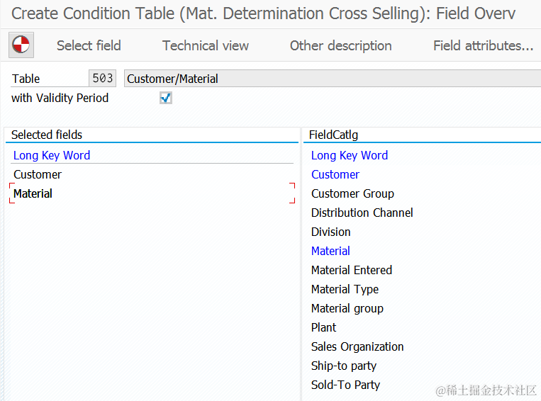 For my requirement, I would simply would like to make new material determined by existing material entered in Sales order line item plus customer as sold to party, so I only choose two fields: Customer and Material.