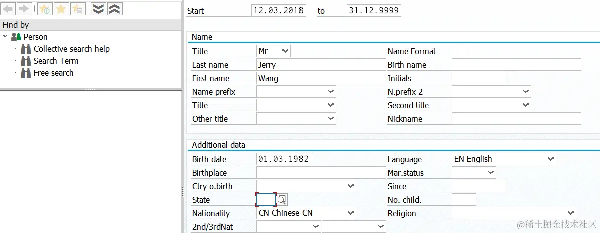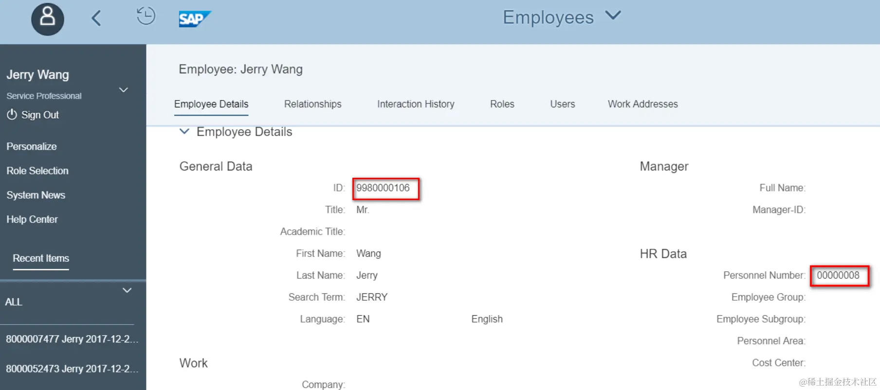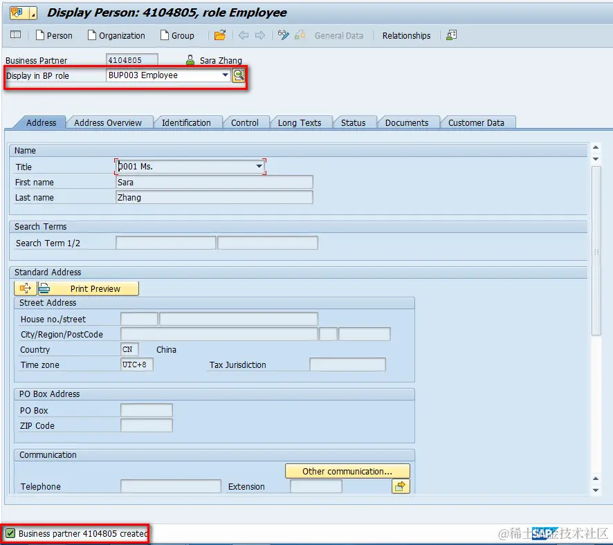 Once done, you can display the created employee in WebClient UI. Keep in mind the personel number found in tcode PA30 is just the number of HR data but not the employee ID in S4CRM. In my example the employee ID is 9980000106 as displayed below.