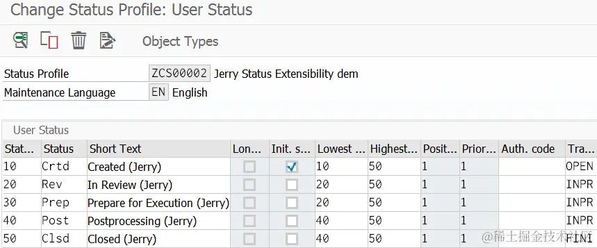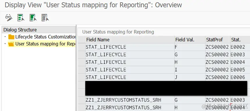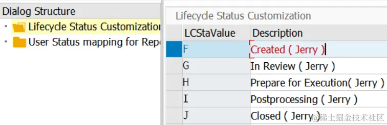 (2) Tcode SM34, open view CRMS4VC_STAT_LC, create some lifecycle status value in order to map the user status created in previous step. I use value from F to J as preceding values are occupied by my colleagues in my test system.