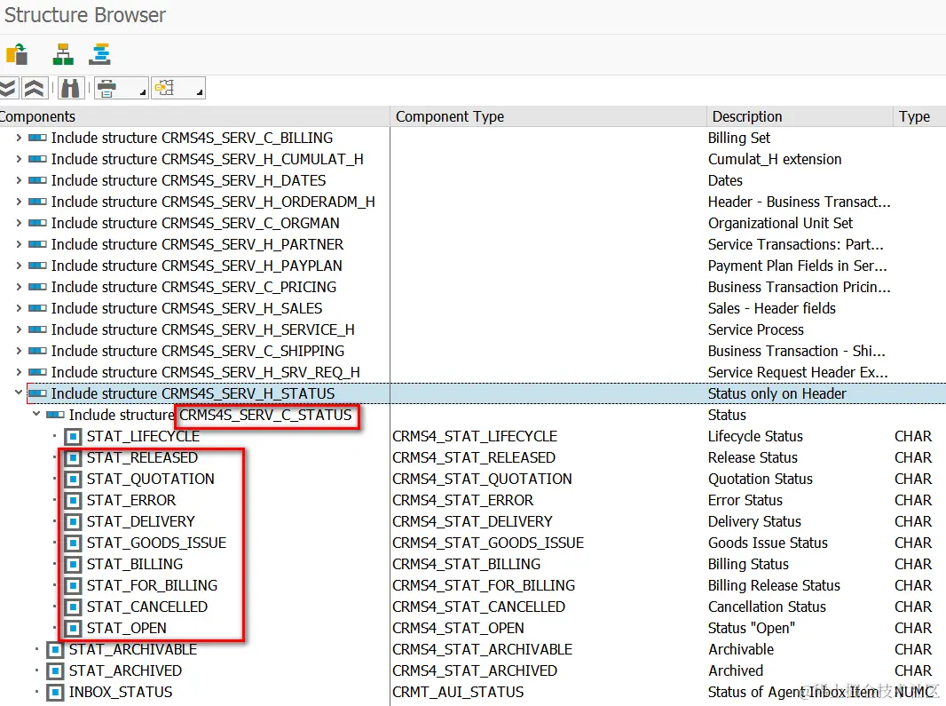 For example, my service order 8000000424 has flag STAT_ERROR and STAT_OPEN as X, which means it has system status I1030 and does not have I1005.