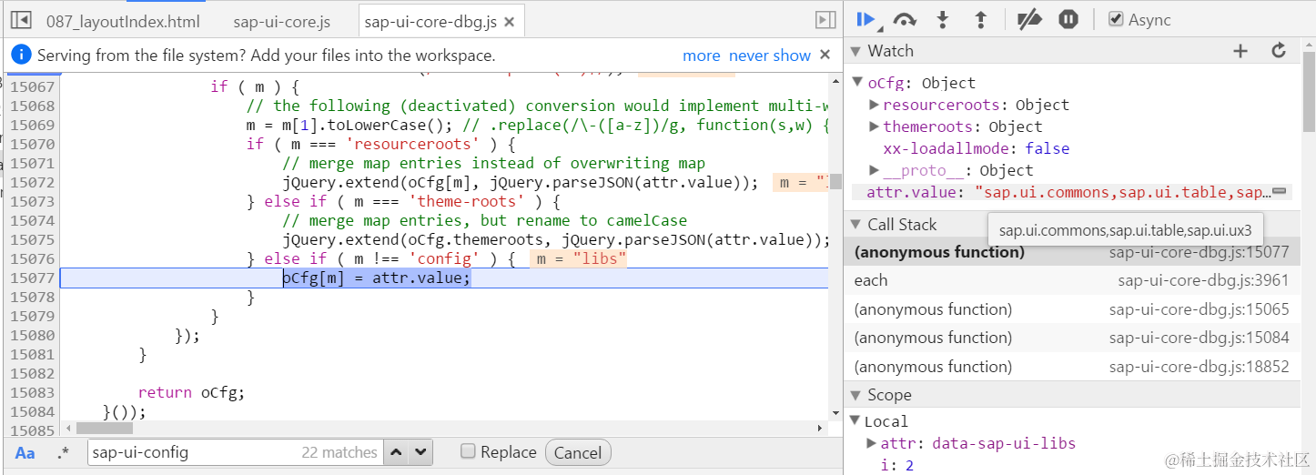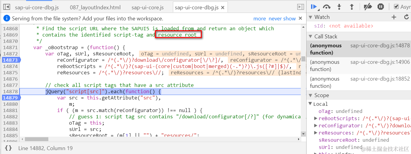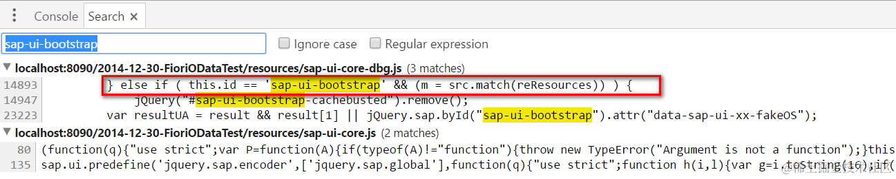 Perform global search with the hard coded key word “sap-ui-bootstrap”, set a break point on search result, line 14893 below.