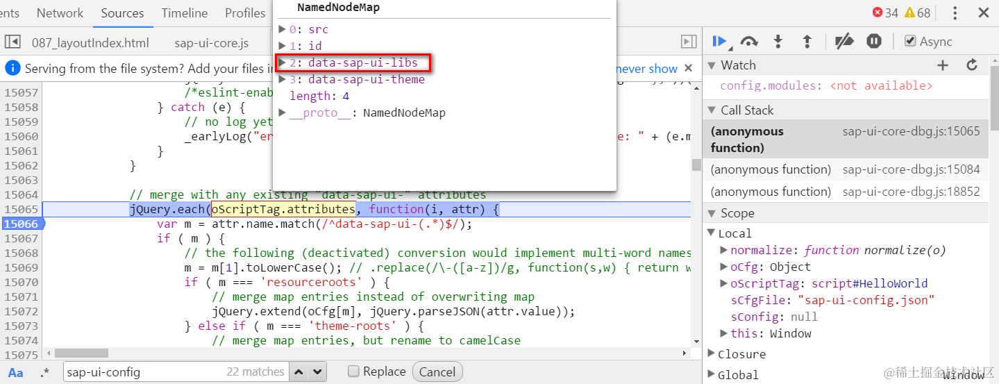 The logic of UI5 framework to determine whether a script tag is a “bootstrap” tag is done by three regular expression evaluation ( see variables reConfigurator, reBootScripts and reResources in below screenshot ).
