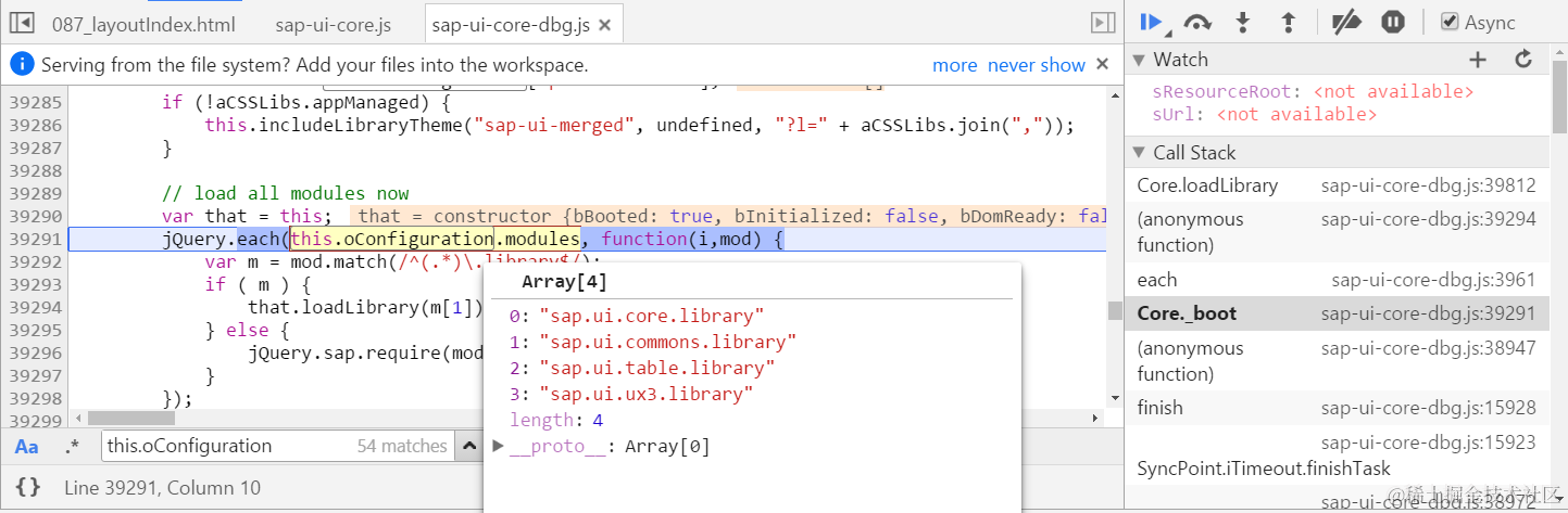 Refresh the application and break point is triggered. Through the comment of the function we can know that it is responsible to parse the bootstrap script node we define in index.html to determine the resource root.