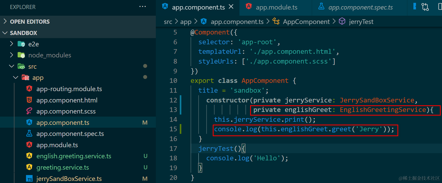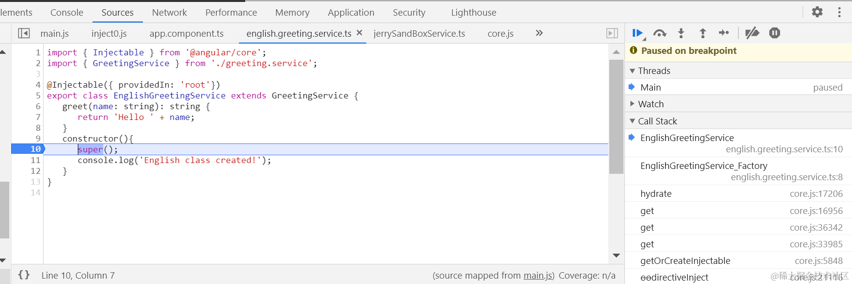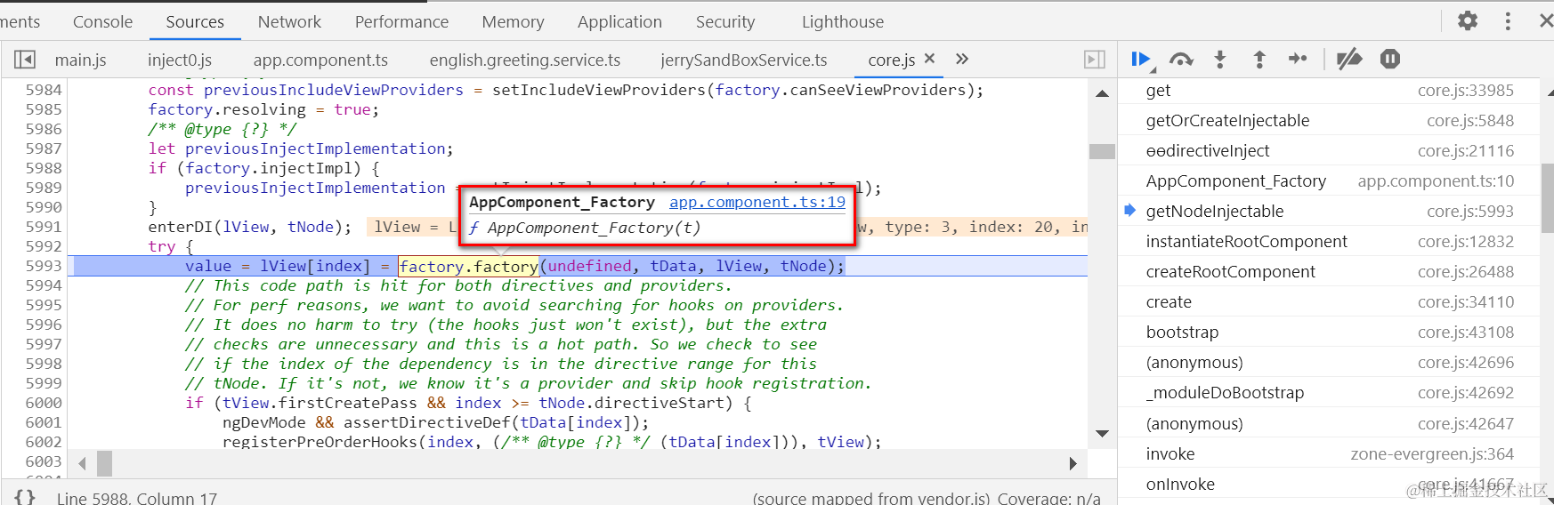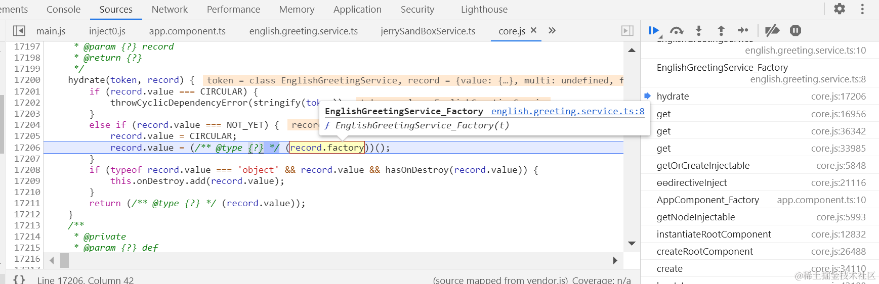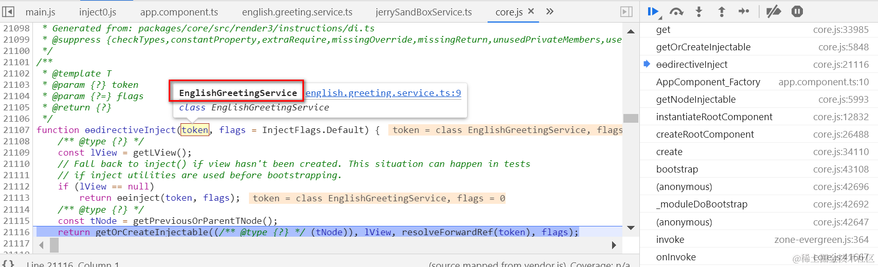 我们通过Angular Injectable注解修饰的服务实现类,已经成功地被解析并出现在了Angular框架实现代码里,通过token变量存储: