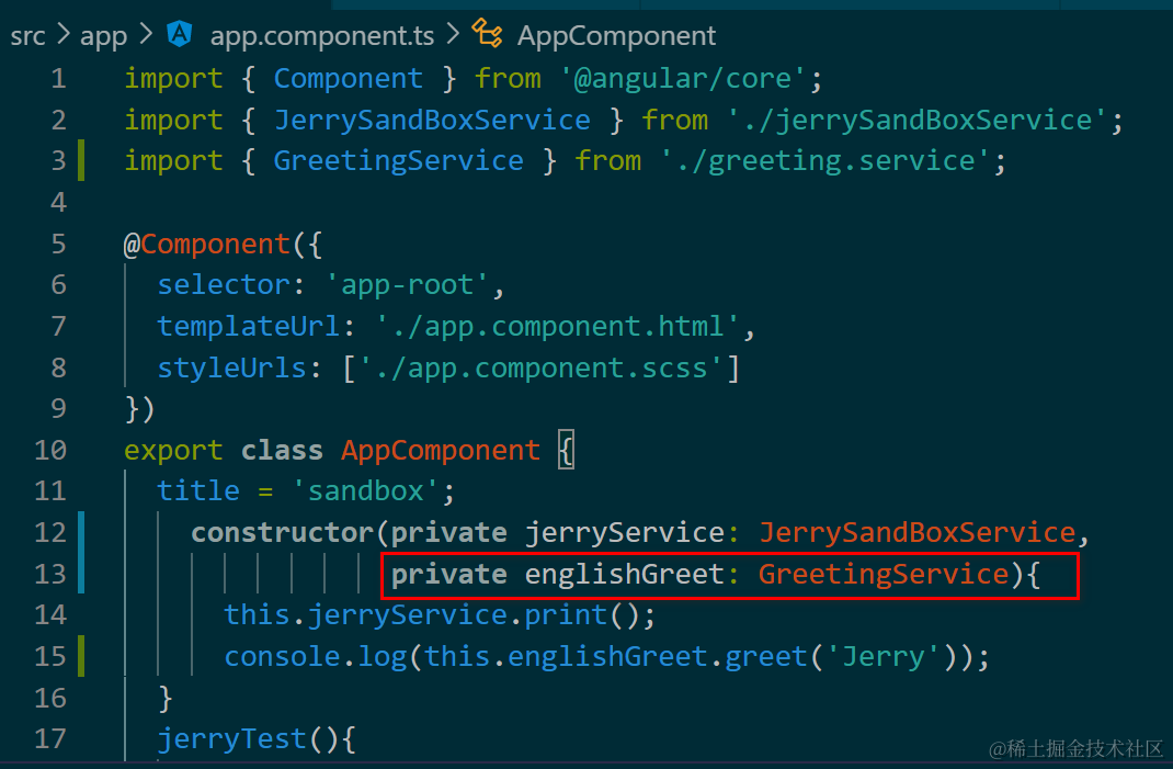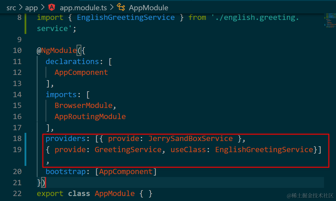 在module的providers区域里,为GreetingService维护具体的实现类:
