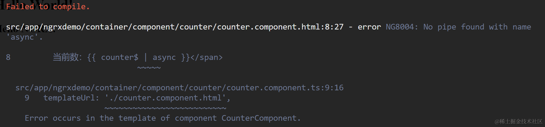 src/app/ngrxdemo/container/component/counter/counter.component.html:8:27 - error NG8004: No pipe found with name ‘async’.