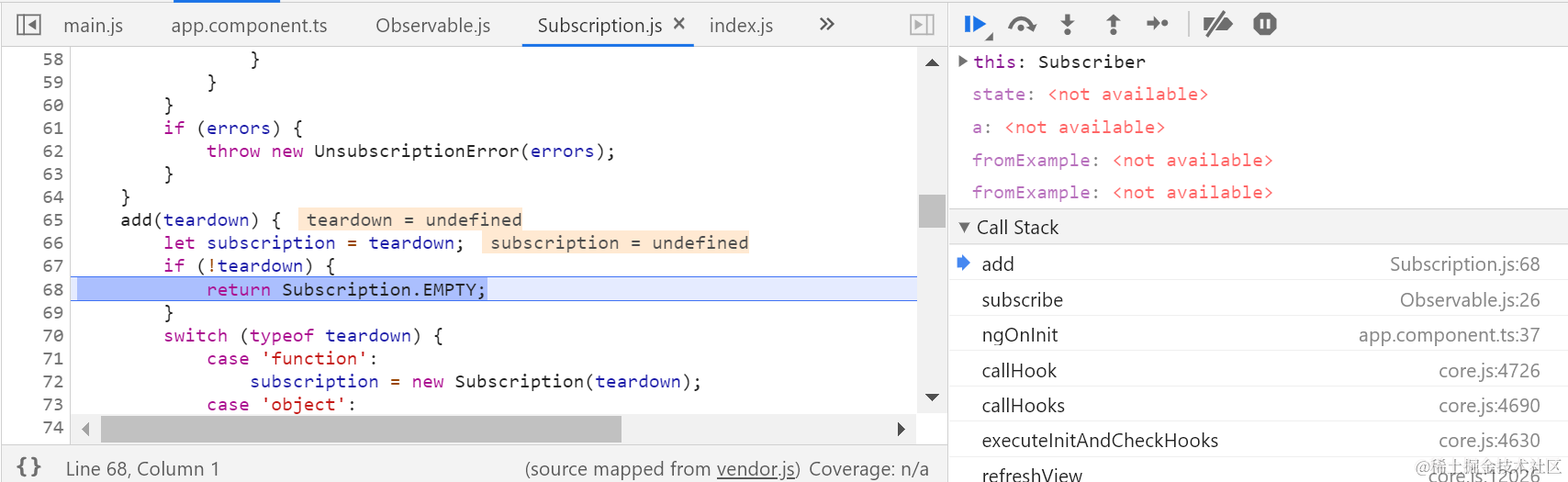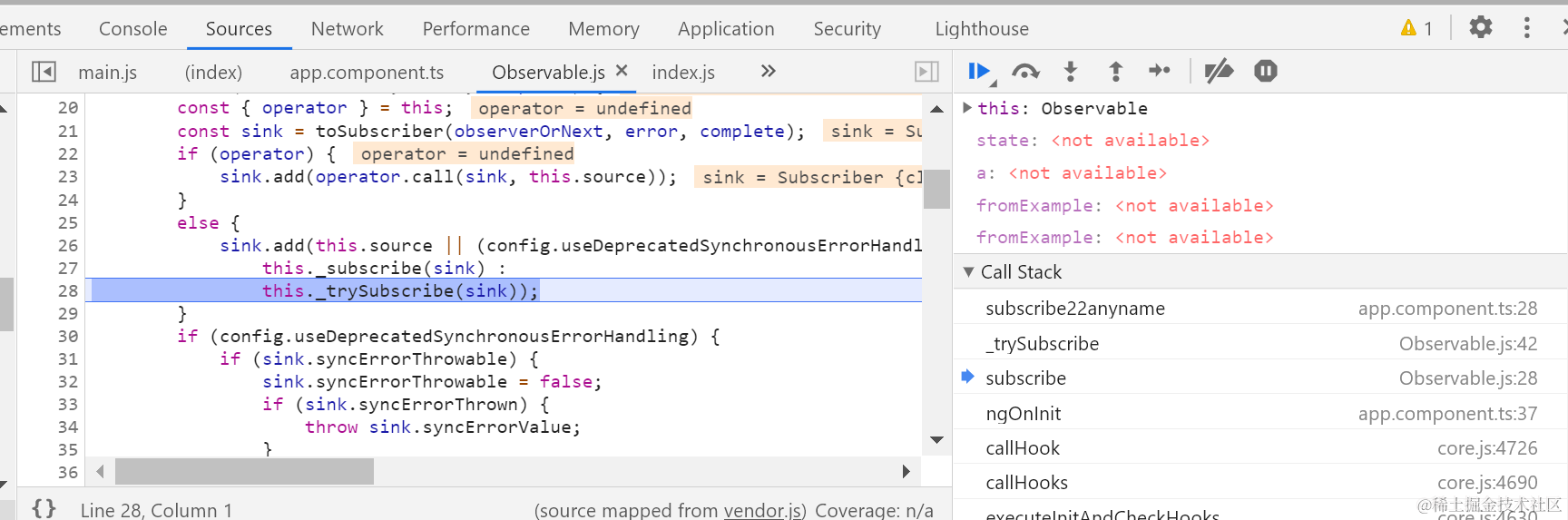 在Observable的构造函数里,将应用程序传入的subscribe方法传入并维护到_subscribe方法里: