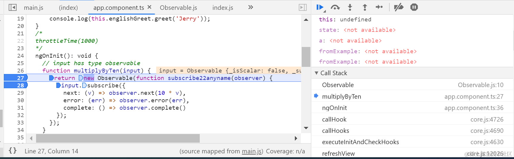 调用我自定义的Operator multiplyByTen, 返回一个新的Observable实例: