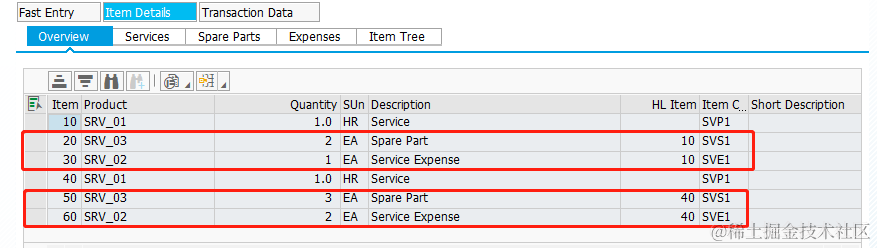 在介绍业务场景之前,我觉得有必要简单的描述下在场景中的各种术语以及业务模型,在S/4HANA Service端我们有Service Order(服务订单)以及对应的Service Item(服务项目,这其中包含了Service Product服务产品Expense费用Spare Parts备件等),在Field Service Management端我们有Service Call(服务请求)Activity(服务活动)以及从属于Activity的Expense, Time effort, Reserved Material等。由此很容易发现我们需要将S/4HANA端的服务订单改造成如下的Hierarchy结构,备件以及费用是挂在服务产品下的。但是在普通的服务订单中,我们时常是不采用这种Hierarchy结构。