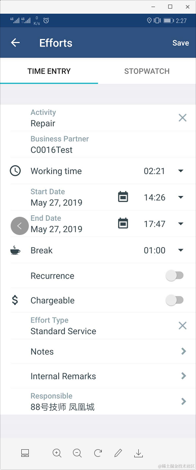 等到技师在现场的服务完成,他会通过手持设备上报本次服务所产生的实际工时,费用,备件信息等并在现场让客户电子签名确认,在此期间可能还存在中途更换技师,或者添加技师的场景。