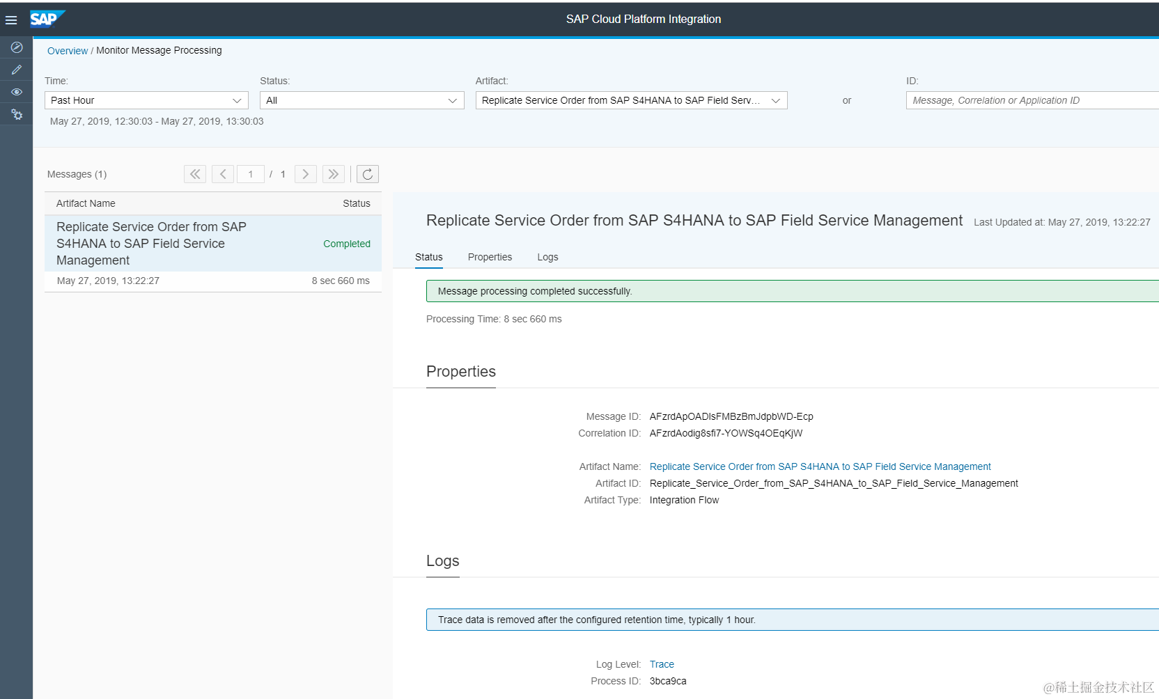 在CPI提供的Monitor里面我们可以看到Iflow已经成功执行。如果在Iflow的执行中出现了任何的错误,那么在这个Monitor里也可以进行查看,从而了解到具体的错误信息。