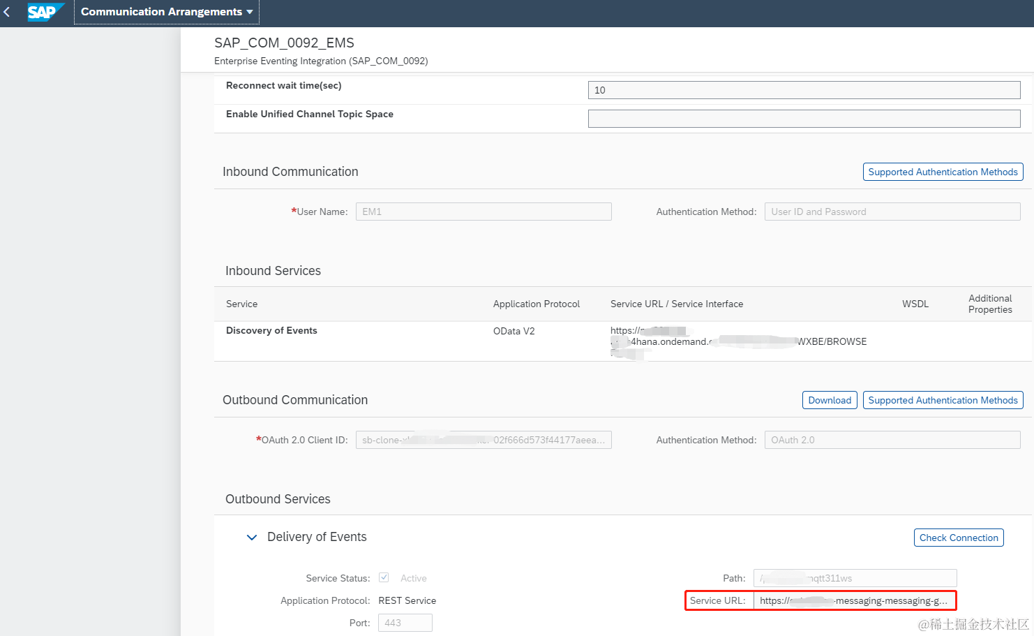 接下来我们需要在S/4HANA Cloud端做相应的Communication Arrangement配置,将EMS Instance生成的endpoint配在这里,这样在S/4HANA端生成服务订单的时候就会通过outbound service找到我们的EMS并且将服务订单的号码传递给EMS。
