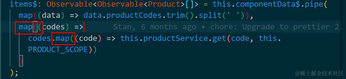 componentData$类型为Observable,调用map的回调里又嵌入了map操作,这是返回类型为嵌套Observable的原因。