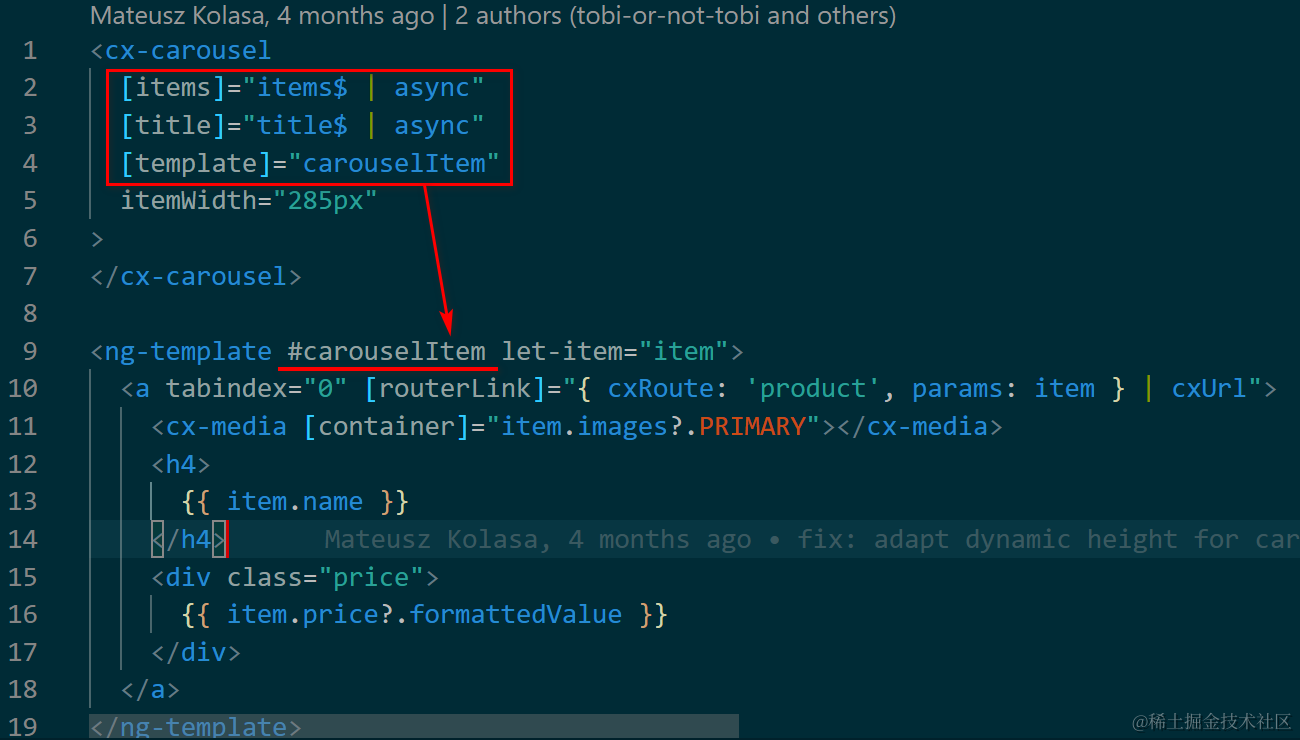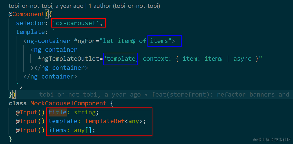 中括号里的items, title和template就是MockCarouselComponent使用@Input()指定的三个属性,等号右边的items , t i t l e , title ,title和carouseItem都是另一个Component本身的属性。