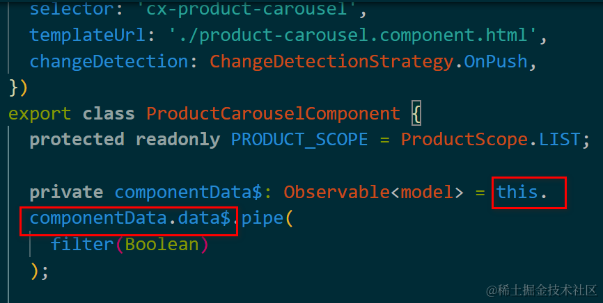 this.componentData$是从Commerce Cloud后台返回的原始数据,但是UI展示只对title感兴趣,所以调用map operator进行数据映射。