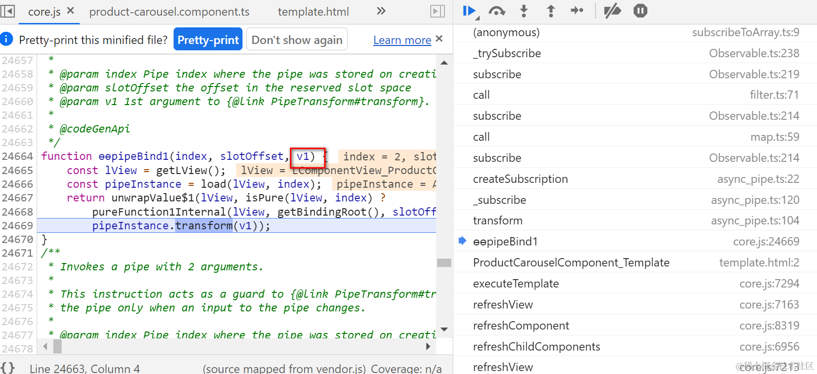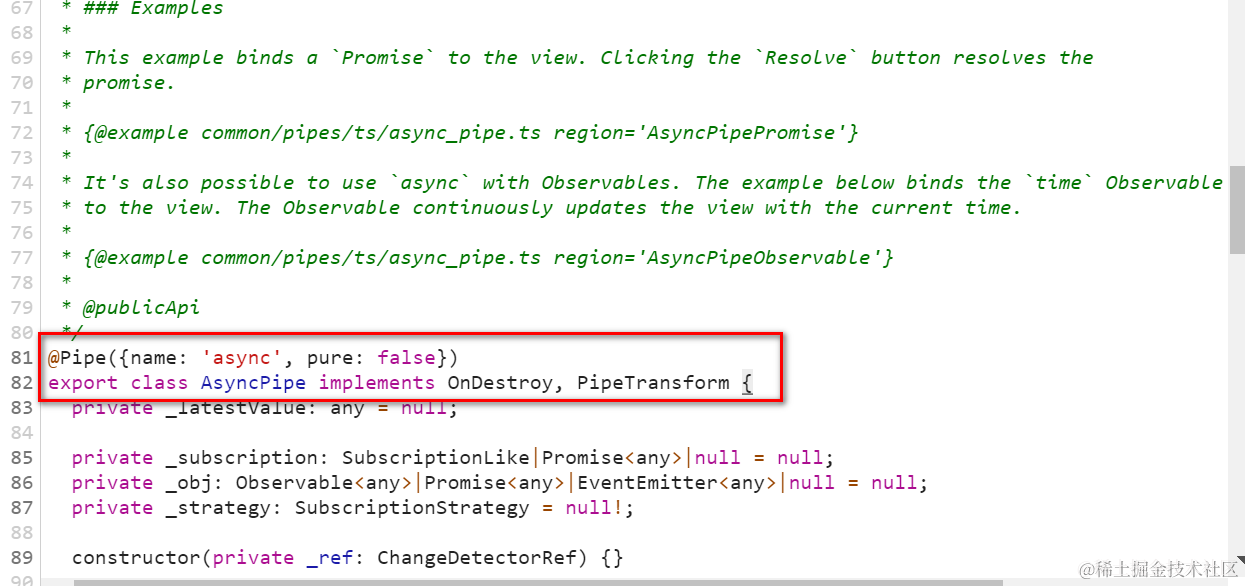 async pipe的实现类是AsyncPipe,实现了PipeTransform接口的transform方法: