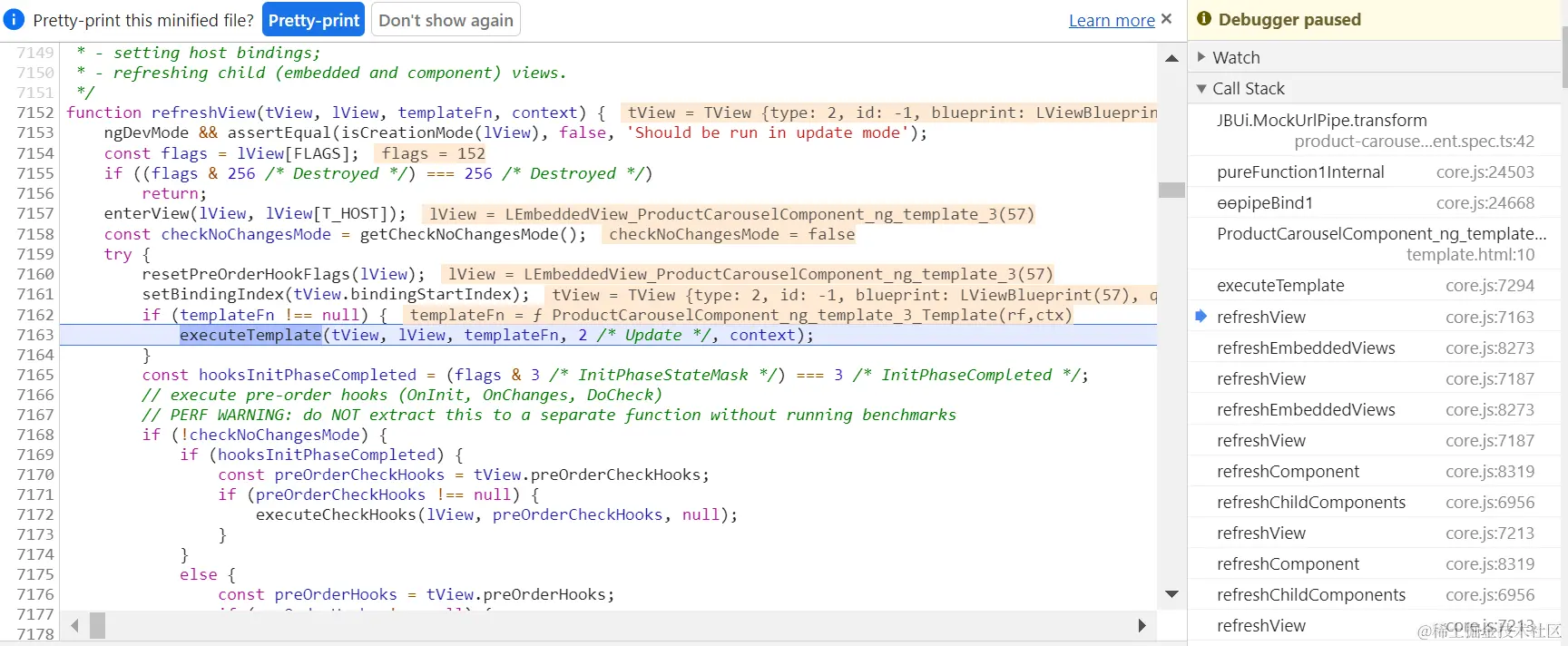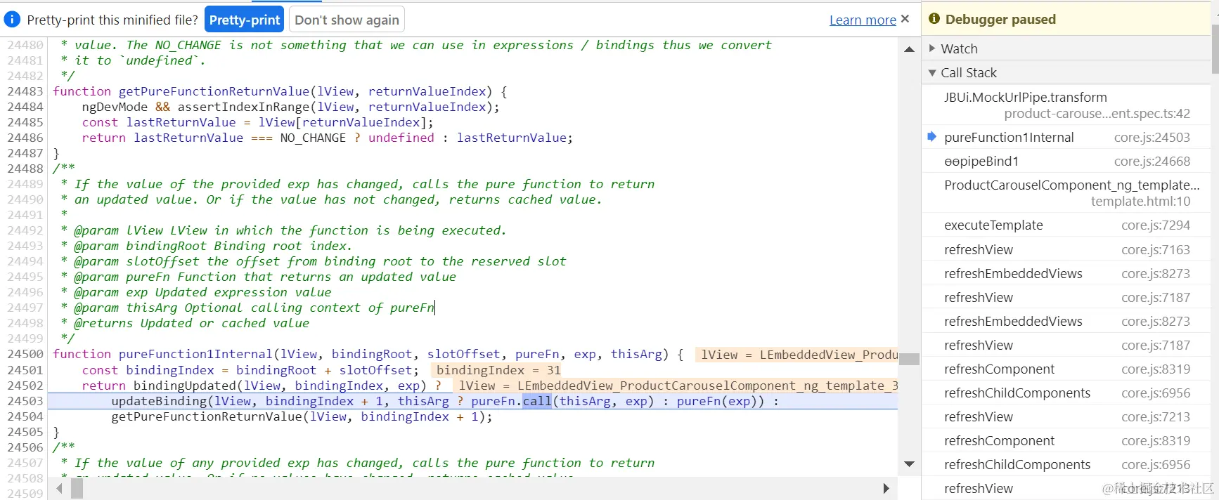 只有当pipe的输入参数发生变化时,ɵɵpipeBind1才会触发: