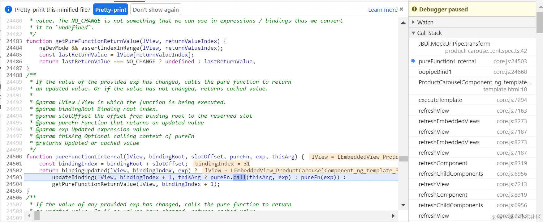 绑定表达式的值发生变化时,触发pureFunction1Internal,重新计算绑定的值: