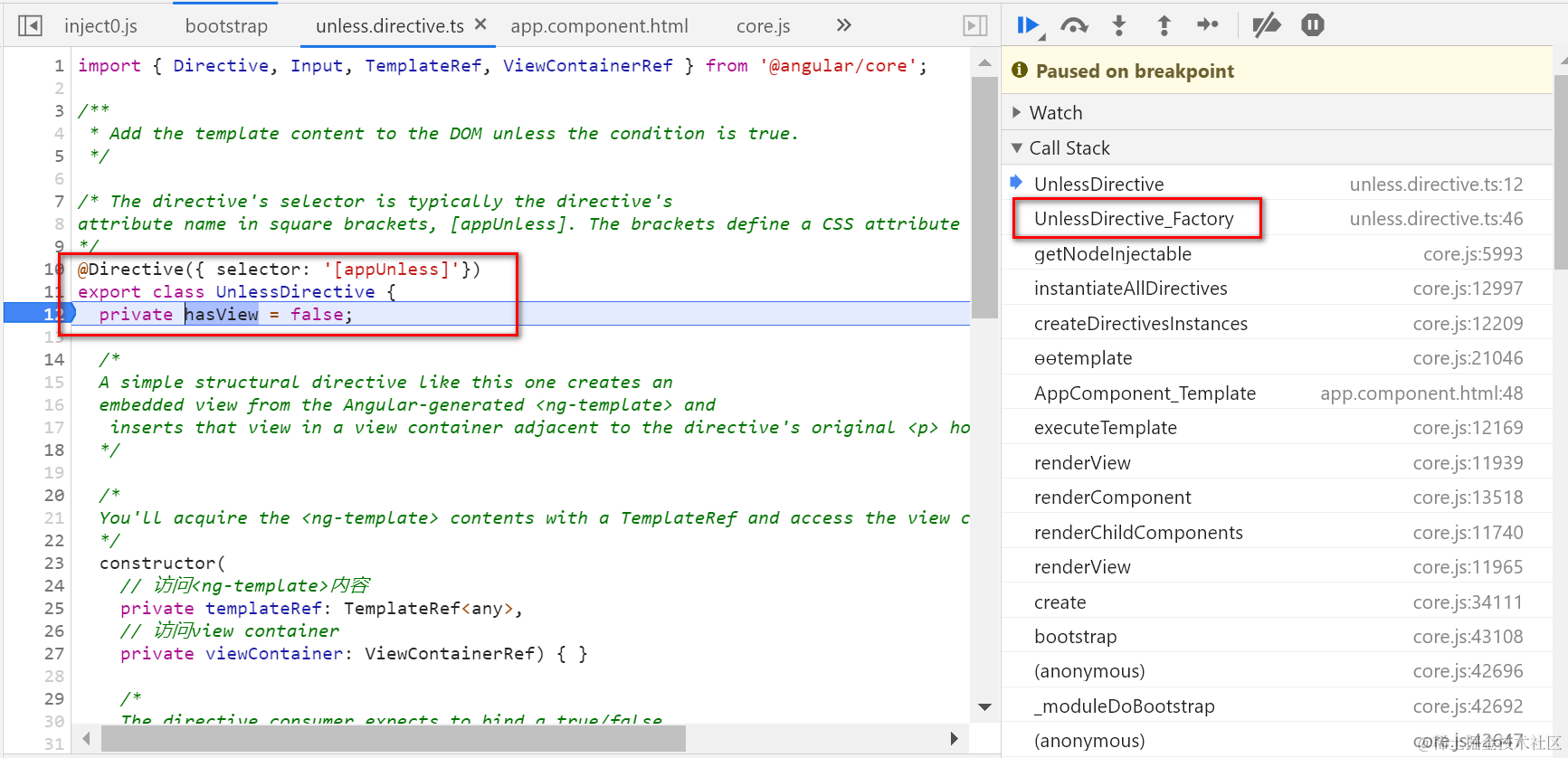 自定义指令的属性和构造函数在指令工厂里被调用: