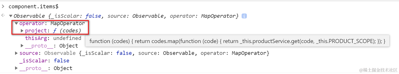 Observable的operator属性,存放的是通过source Observable对象,施加了哪一个操作后得到的当前Observable对象。上述截图的operator->project, 对应了下图高亮的函数: