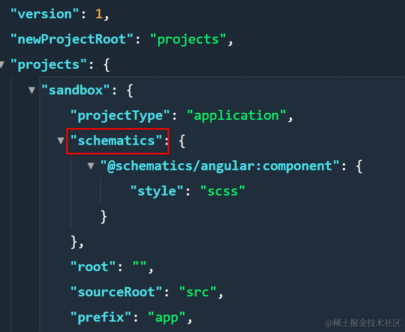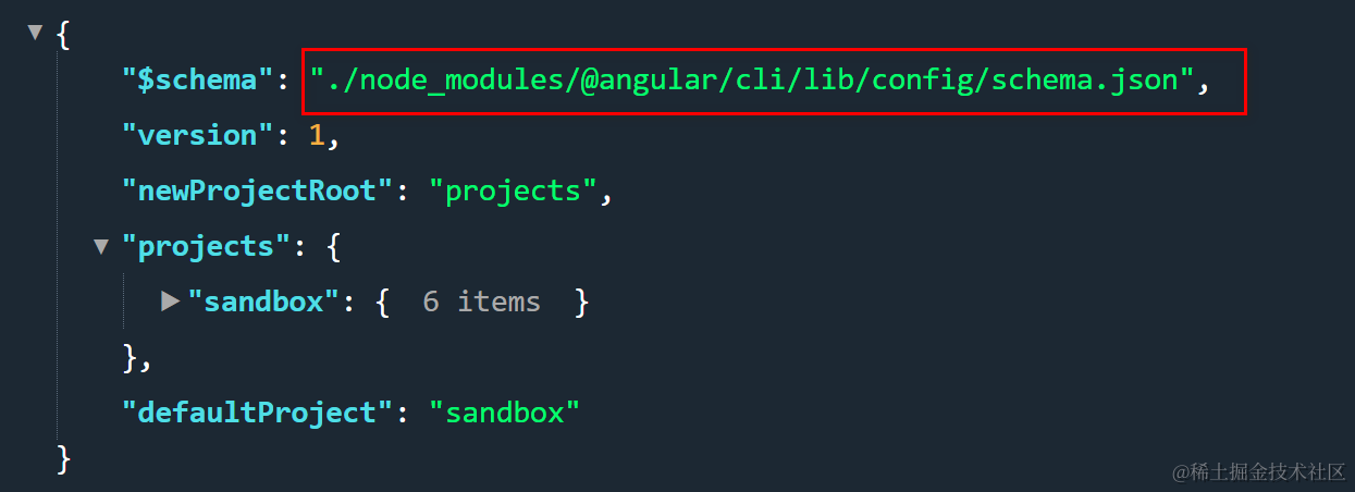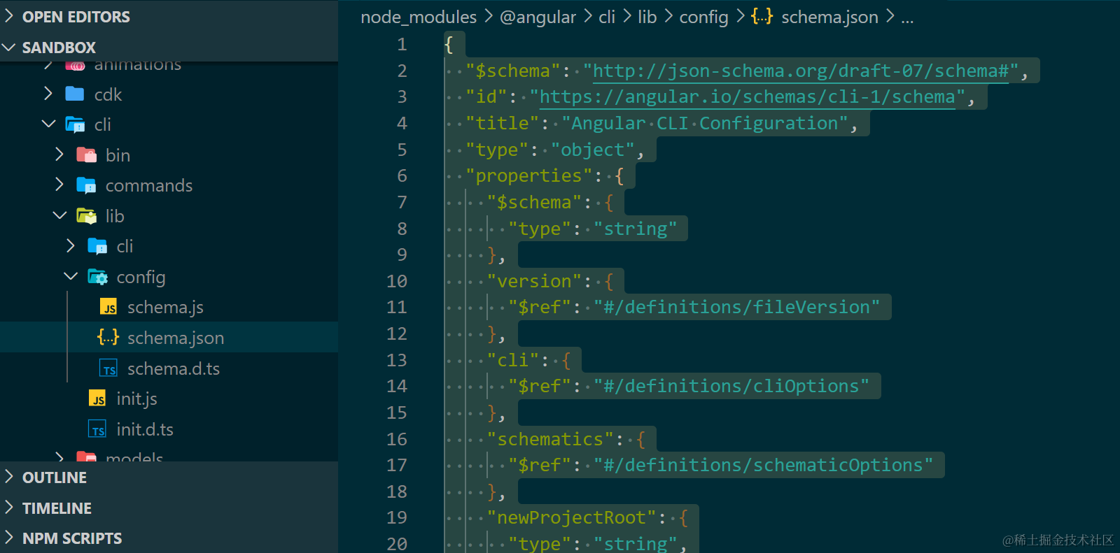 我们可以在任何使用Angular cli创建的Angular应用的node_module对应路径下找到这个schema.json文件:C:\Code\SPA\sandbox\node_modules@angular\cli\lib\config\schema.json