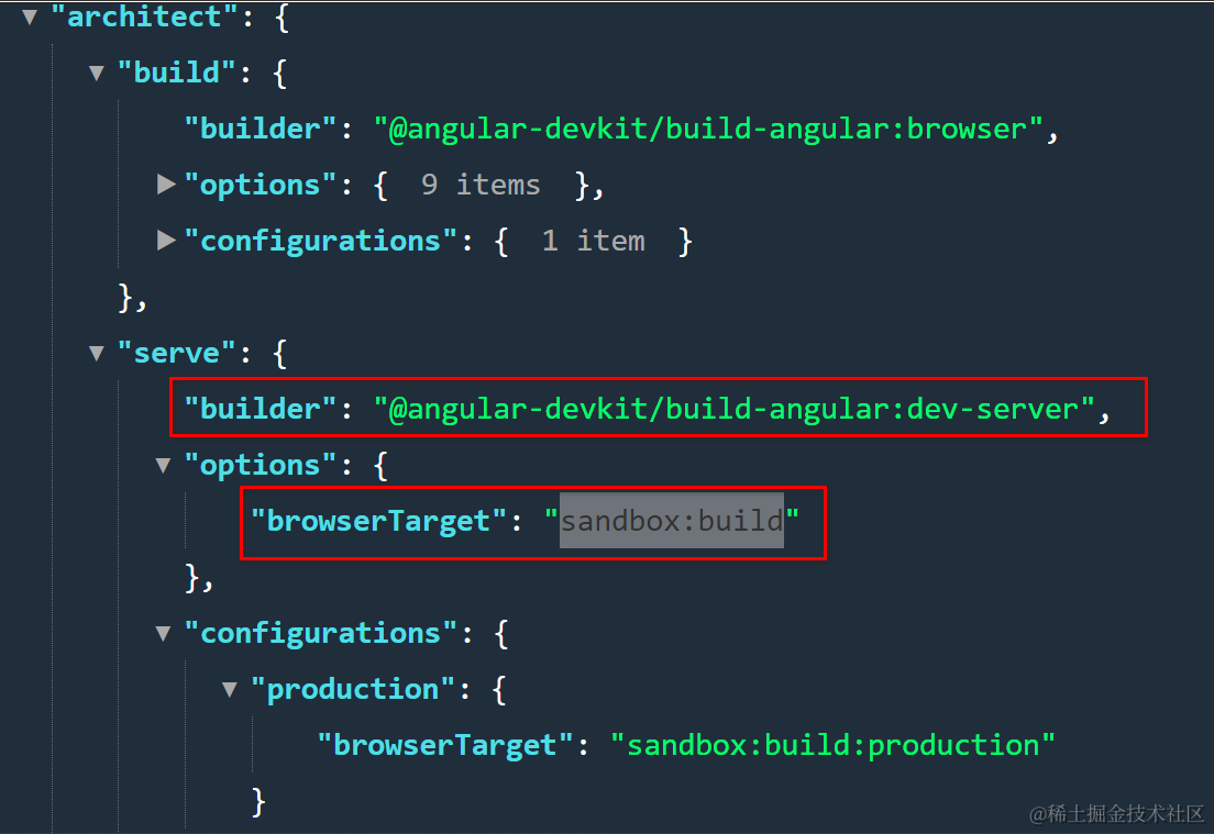 ng serve指向的目标是sandbox:build, 使用的builder为@angular-devkit/build-angular:dev-server:
