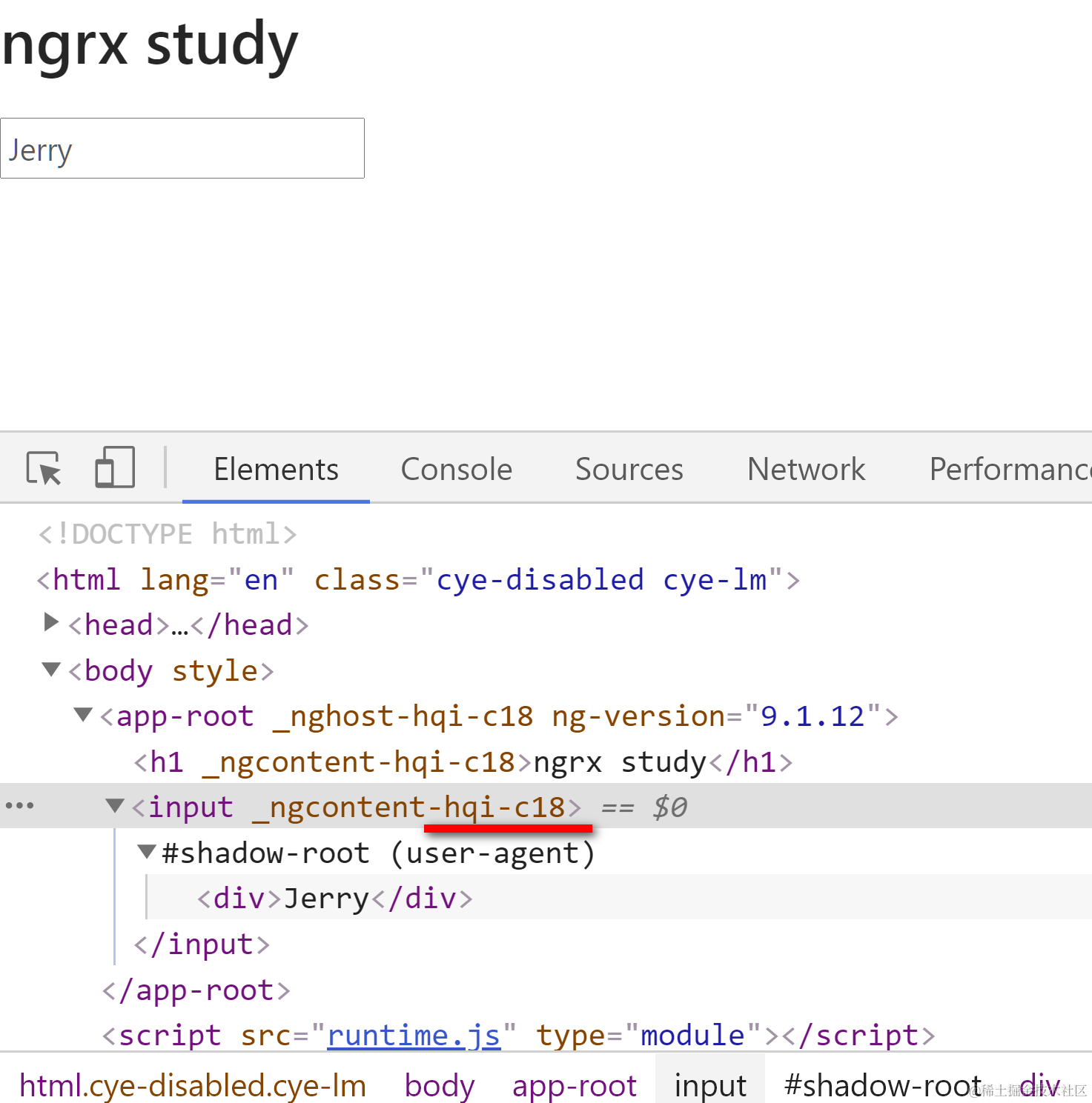 我们打开Angular应用,在Chrome开发者工具的Elements面板里可以看到控件被自动加上了形如下图_ngcontent-hqi-c18这种属性,其中hqi为三位的app id,c18为Componentid.