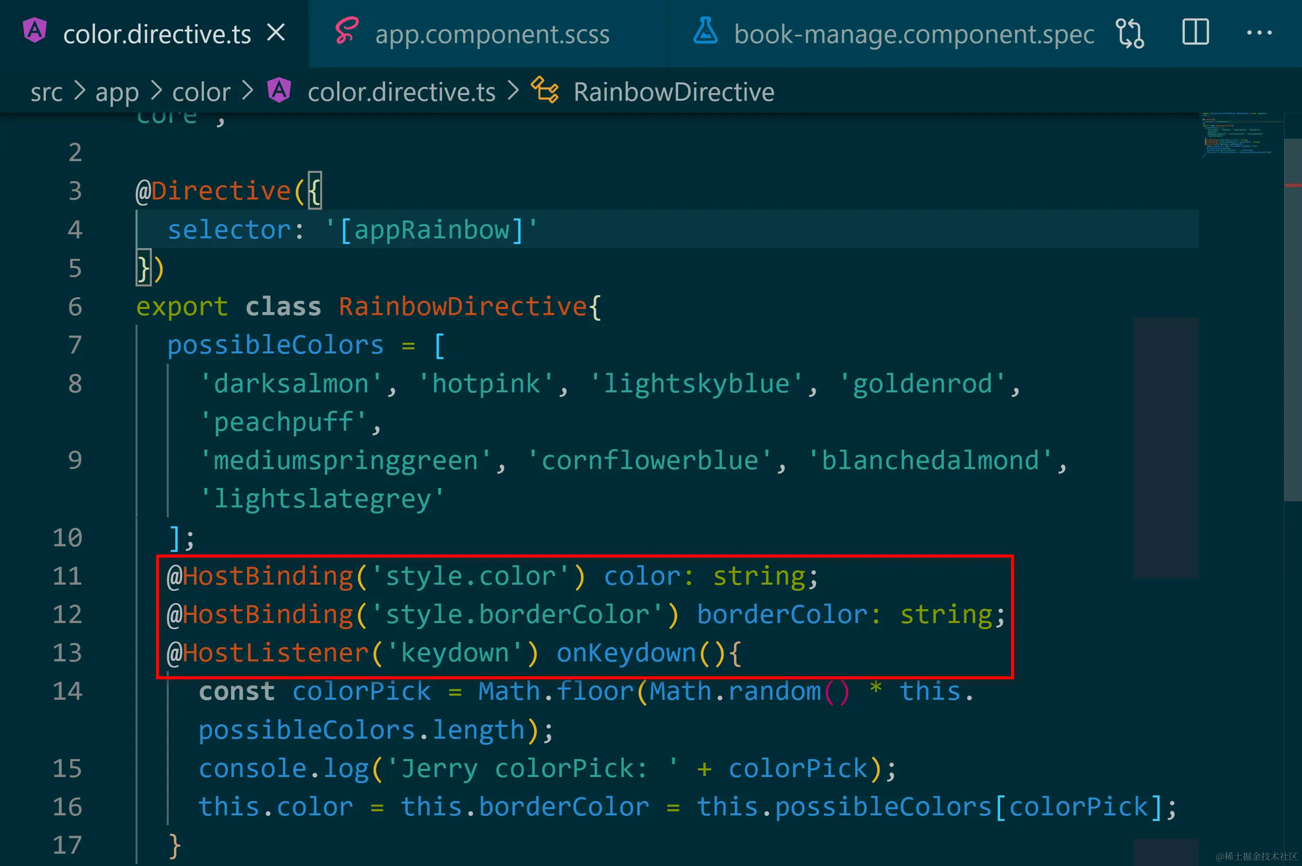 我们将directive内部的color属性值同host元素的css样式style.color建立了绑定关系。这样,用TypeScript修改directive的color属性值,会自动更新host元素的css样式值。
