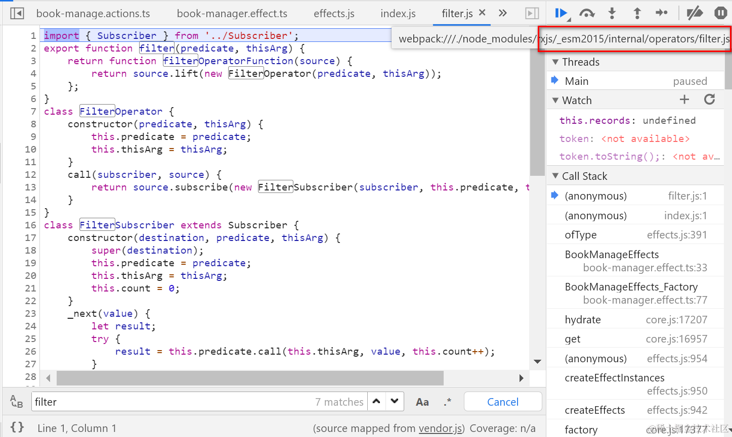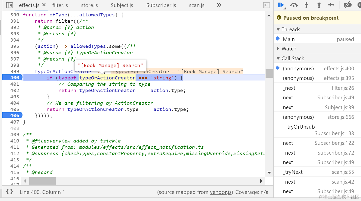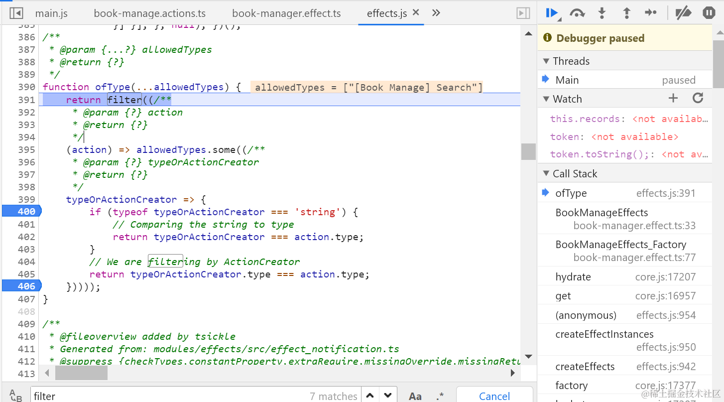 一旦我在UI上输入一个字符后,通过单步调试搞清楚ofType里设置的fitler逻辑是如何工作的:
