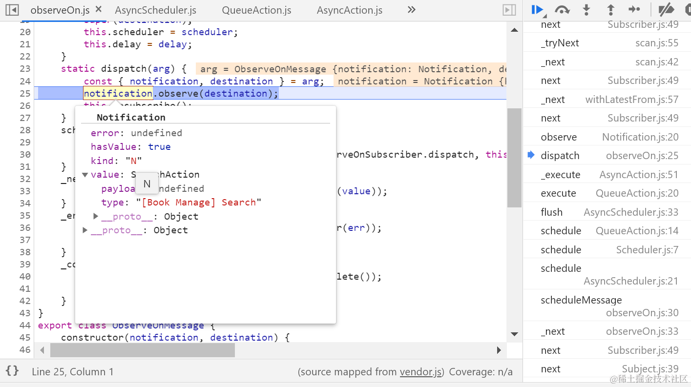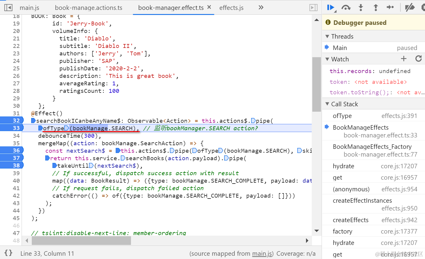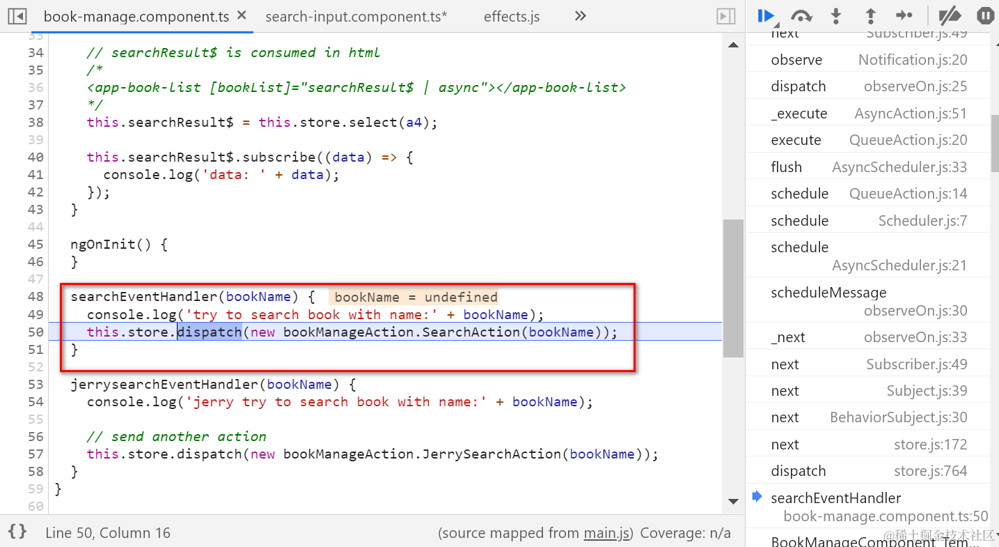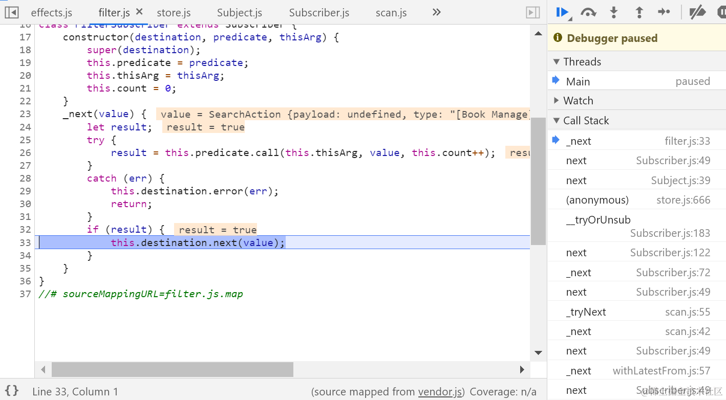 一旦我在UI上输入一个字符后,通过单步调试搞清楚ofType里设置的fitler逻辑是如何工作的: