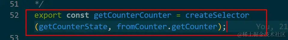 getCounterCounter这个选择器 又是通过另一个选择器和mapping function通过createSelector加工而成的。Mapping函数一般是将整体State映射成具体业务需要的字段。