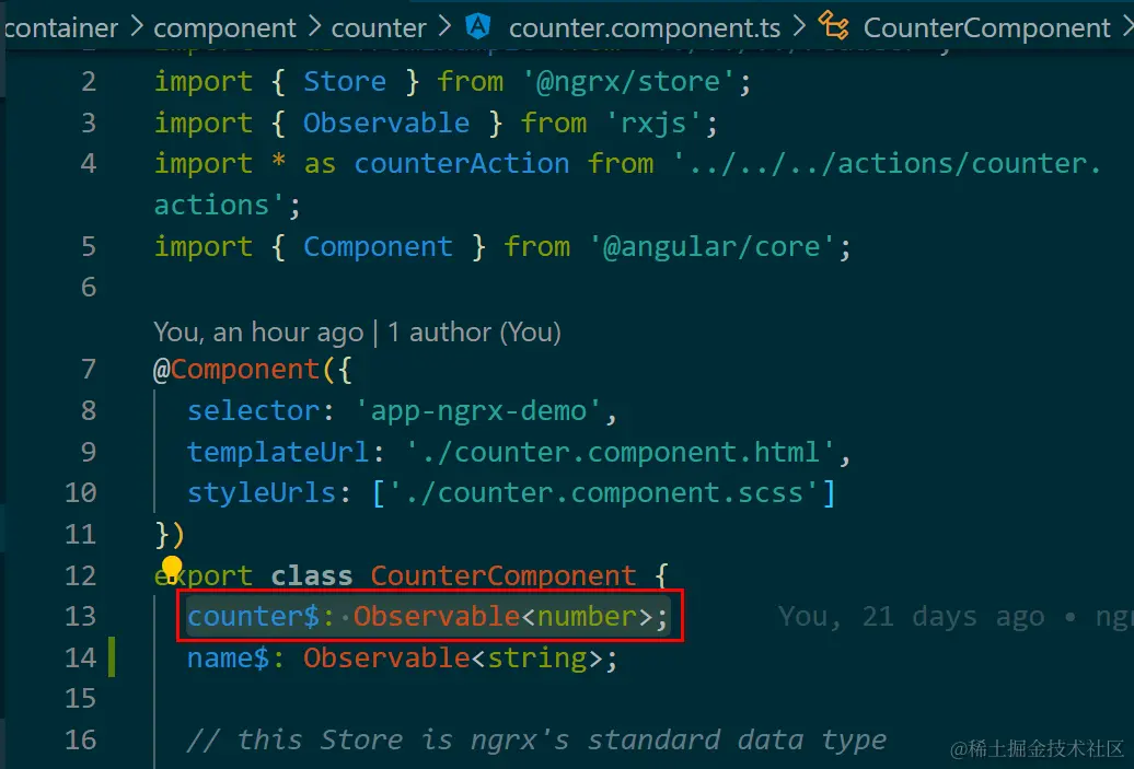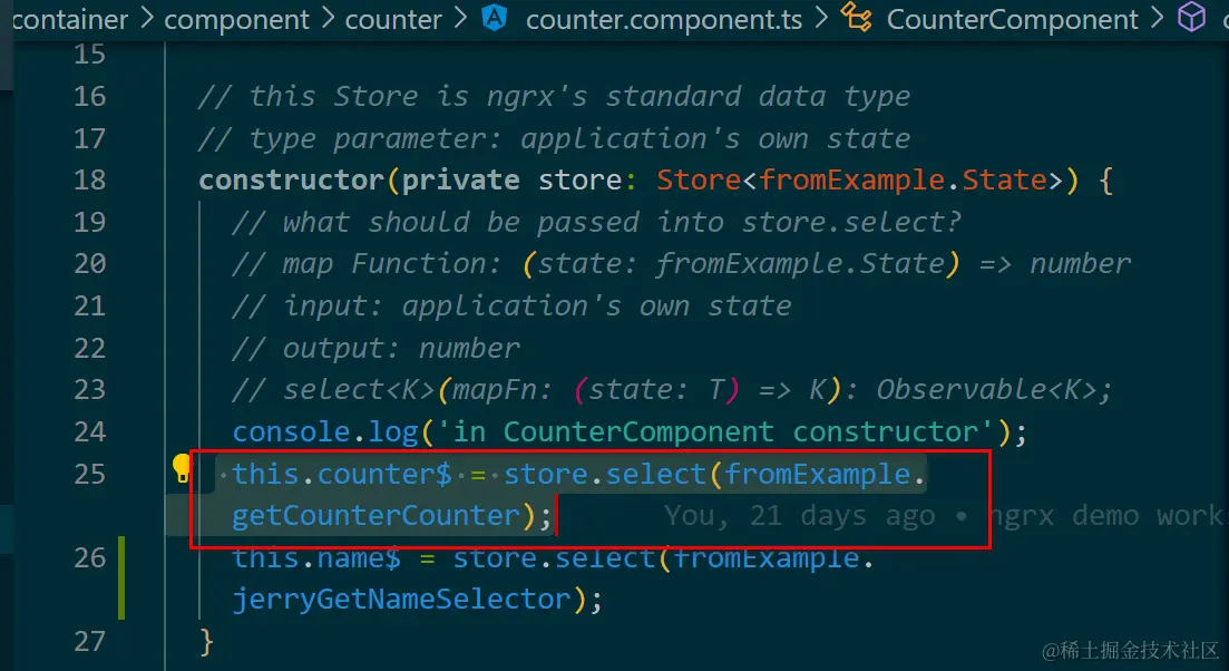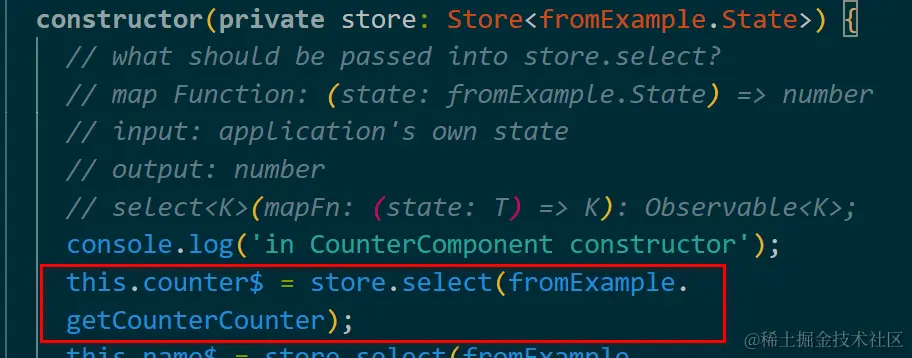 store.select方法里需要传一个memoized selector:fromExample.getCounterCounter